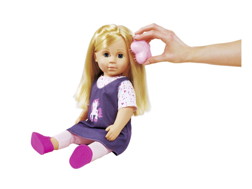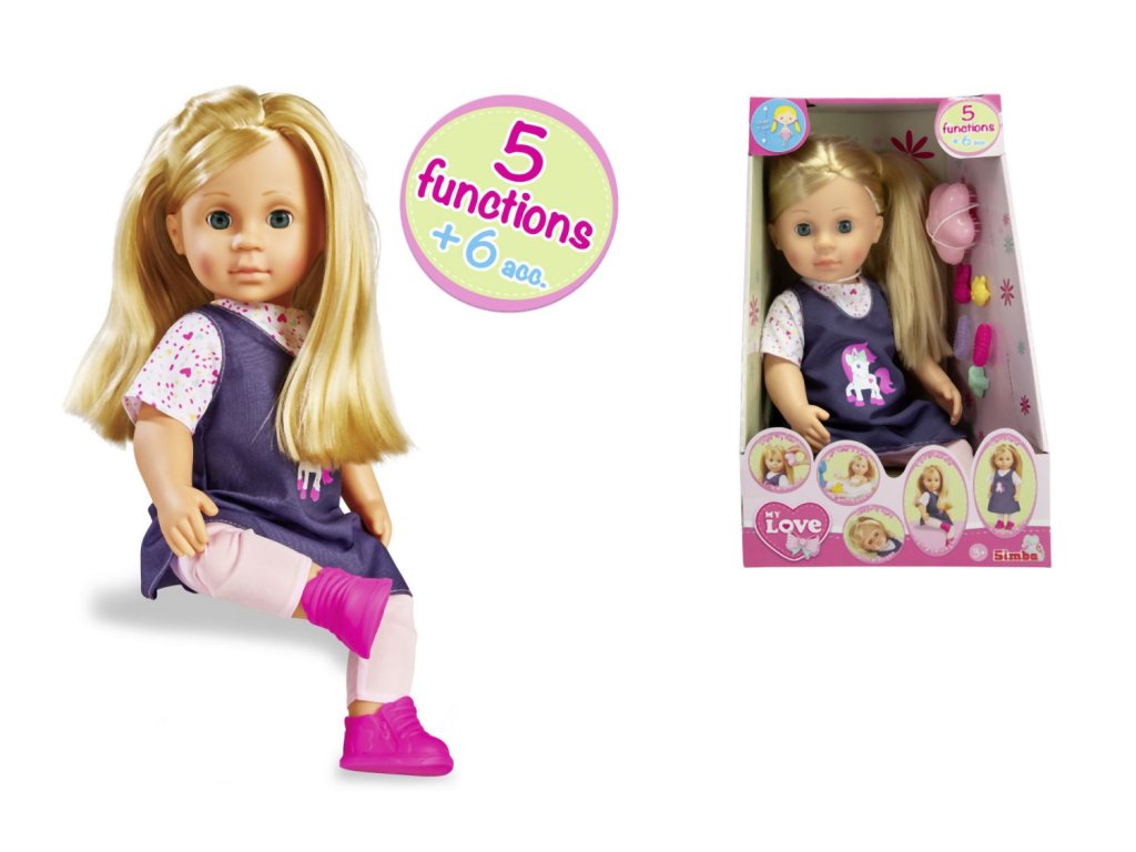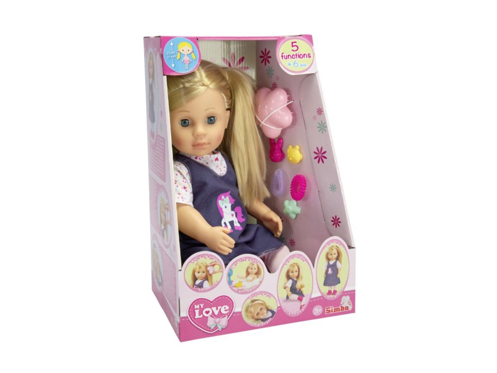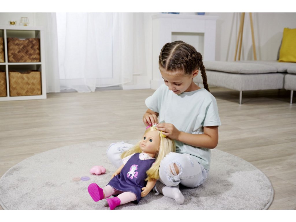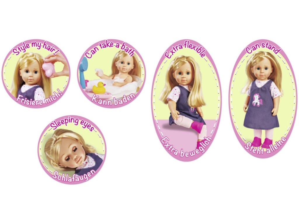 Vinylová panenka My Sister má celkem 5 funkcí - zavírá očíčka, může se koupat ve vaně, umí stát, má extra ohebná kolínka a dlouhé vlasy pro styling. Výška panenky je 43 cm. Součástí jsou doplňky do vlasů 6 ks včetně hřebenu.