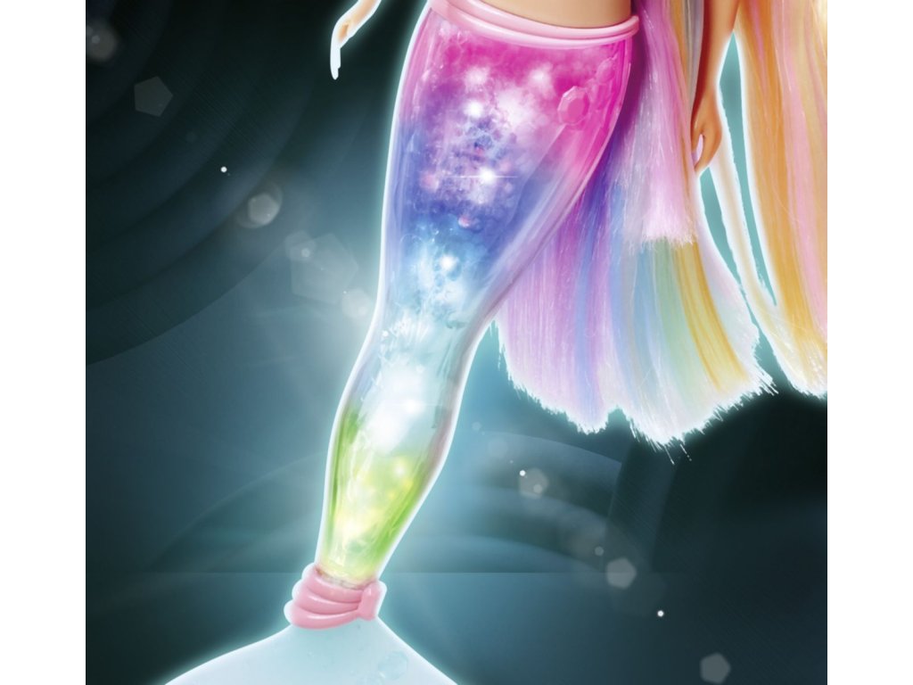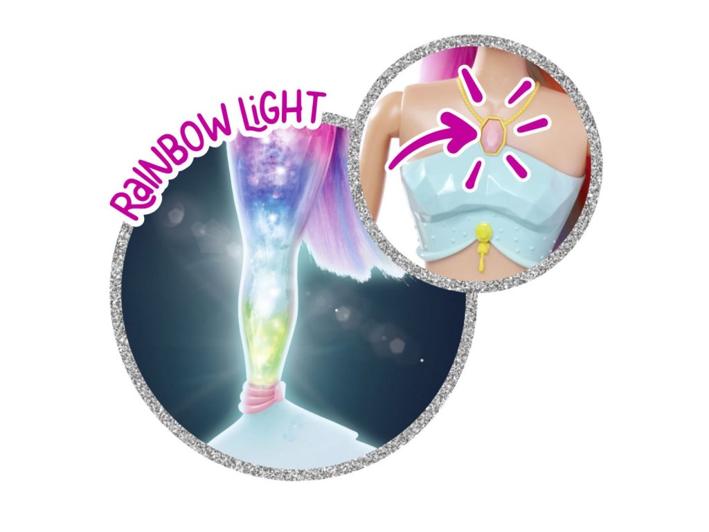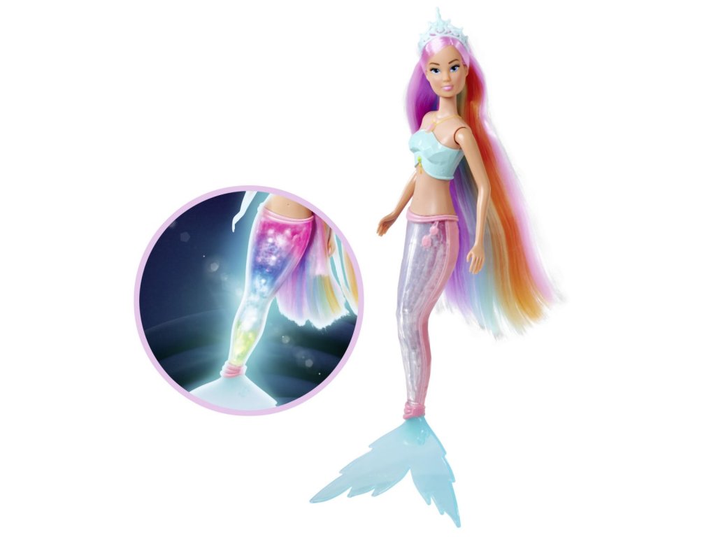 Panenka Steffi jako mořská víla s kouzelnou duhovou světelnou ploutví a extra dlouhými vlasy, voděodolná. Výška panenky 39 cm.