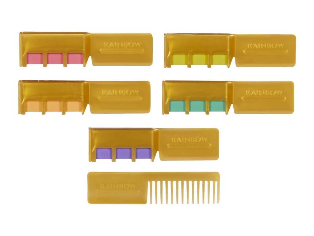 • 5 hřebenů s barevnými křídami na vlasy (červené, oranžové, žluté, tyrkysové a fialové).
