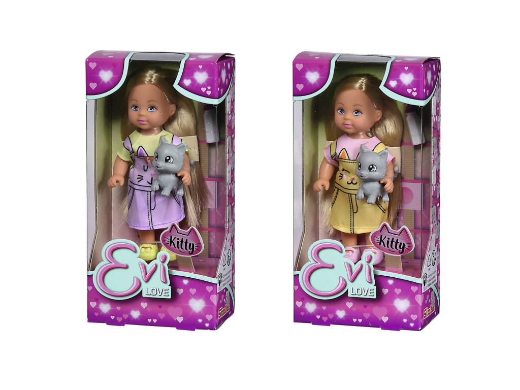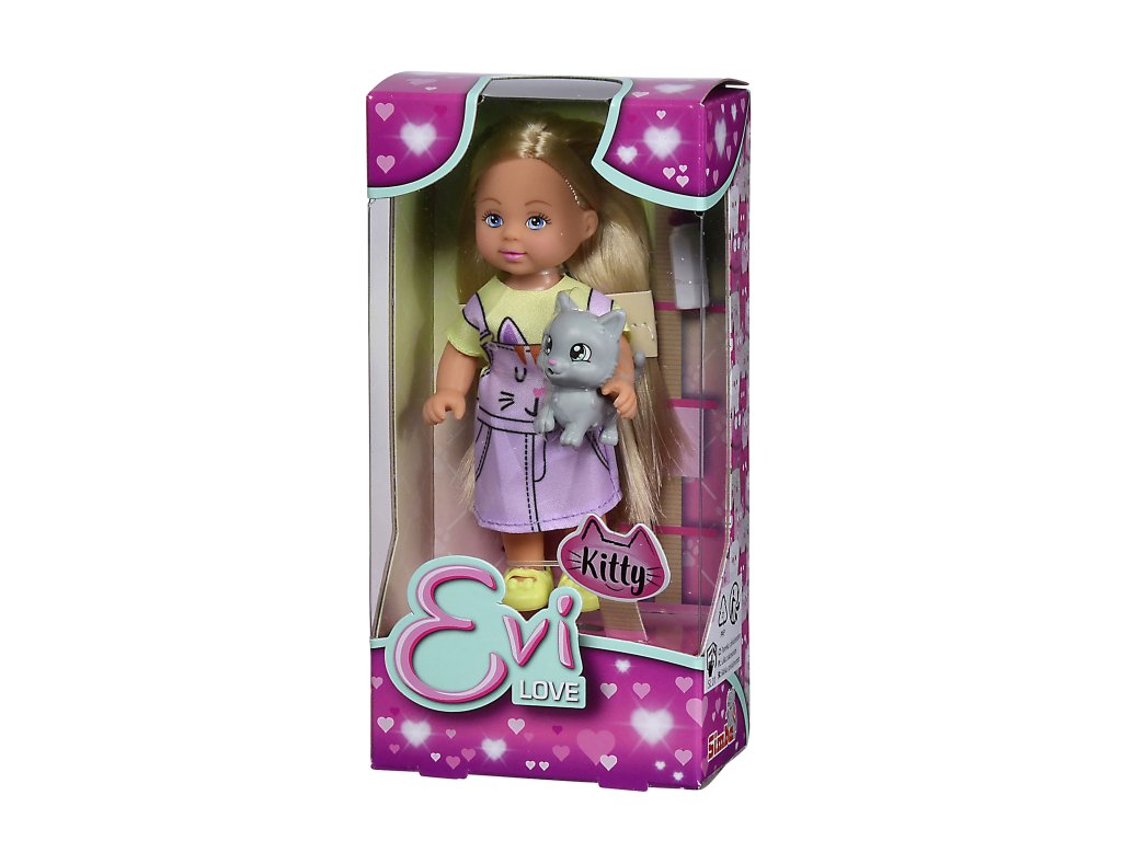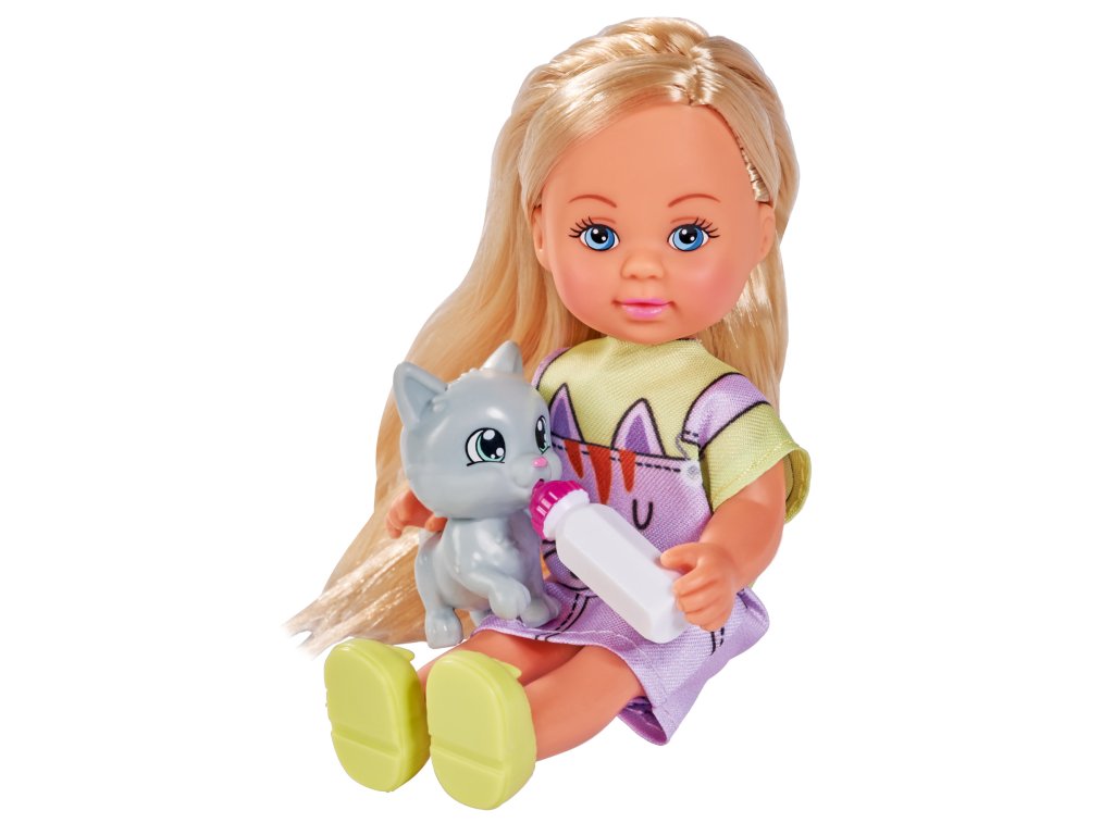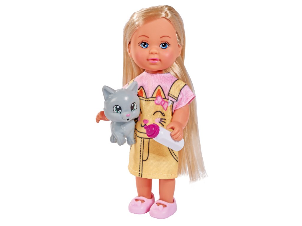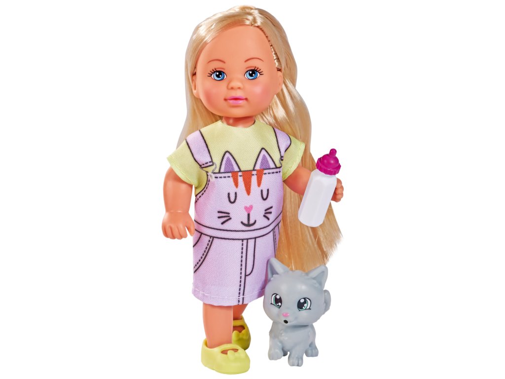 Panenka Evička v roztomilých kočičích šatech s kočičkou a lahví na pití. Velikost panenky 12 cm.