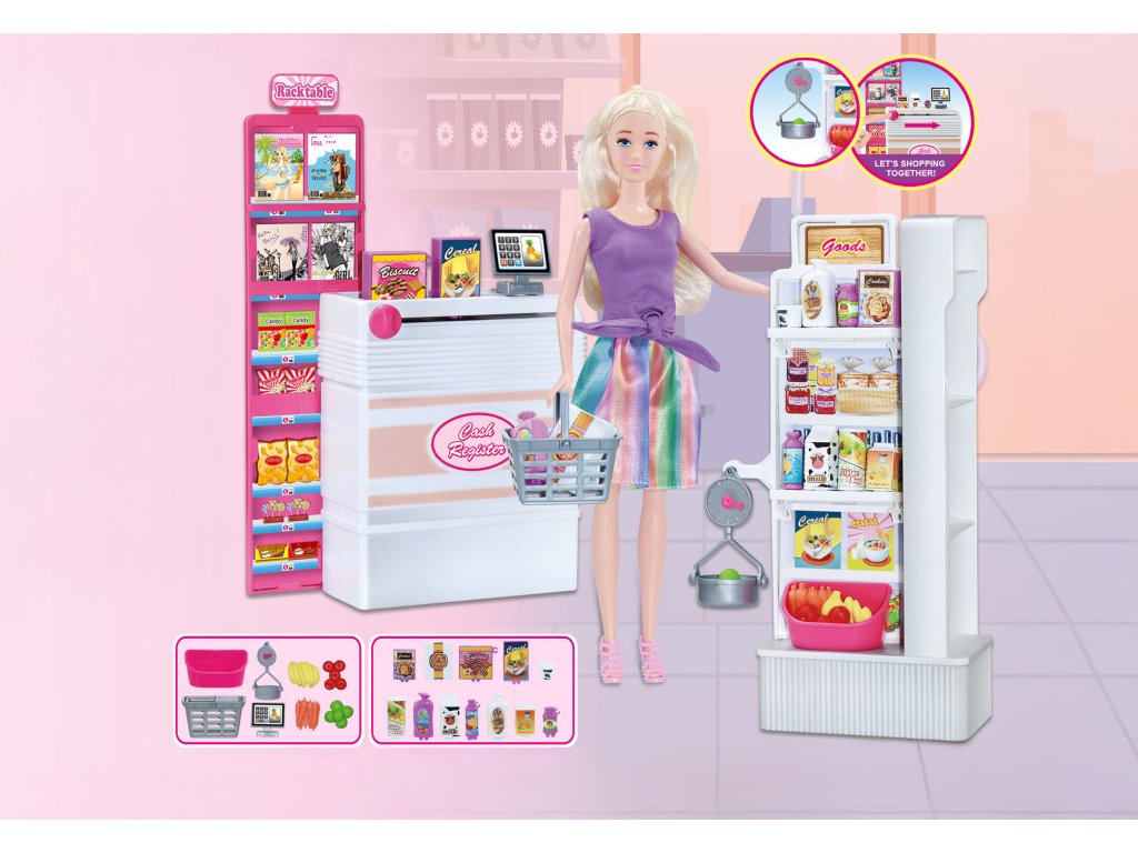 Panenka prodavačka. Velikost 30 cm. Obsahuje panenku, regál na zboží, potraviny a zboží, pokladnu s pásem, nákupní košík a další doplňky.