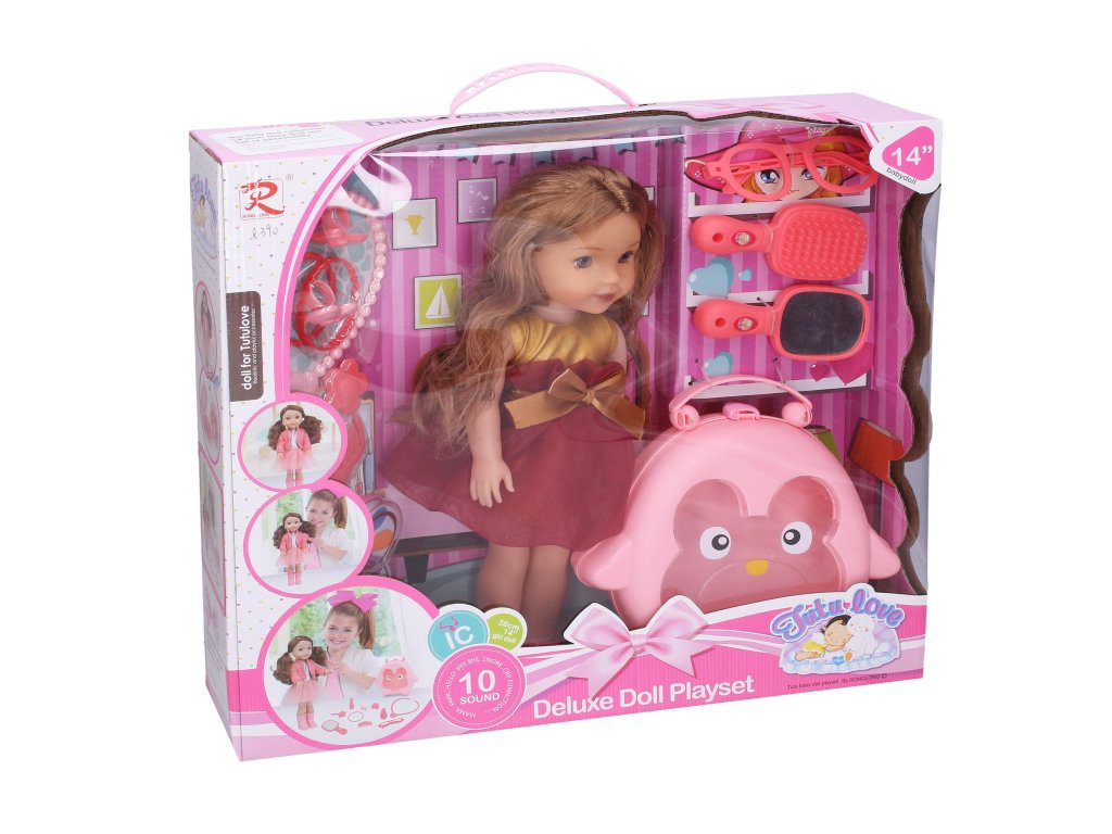 Panenka s příslušenstvím. Velikost 35cm. Zvukové efekty. Obsahuje panenku, příslušenství pro panenku i pro holčičku, kabelku na uložení příslušenství. 3xAG13 baterie součástí.