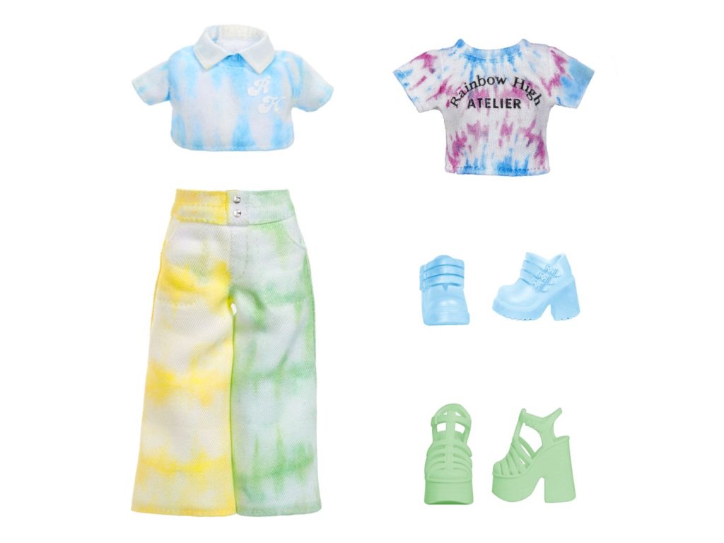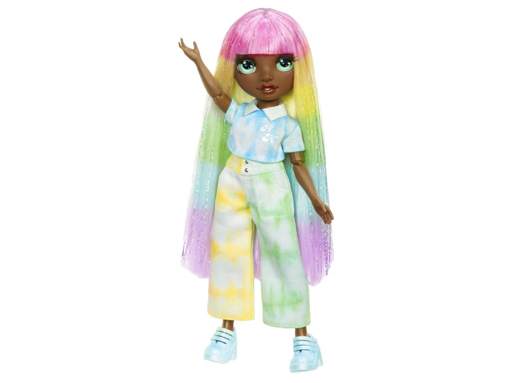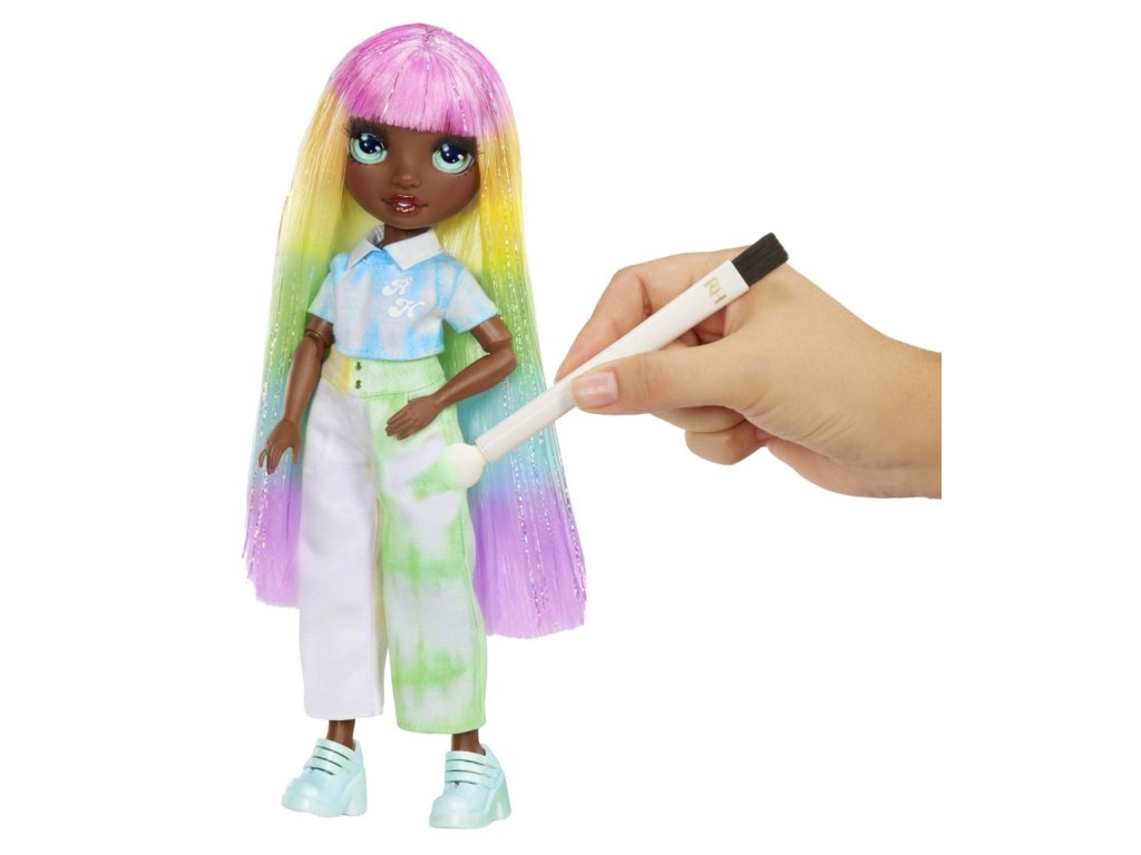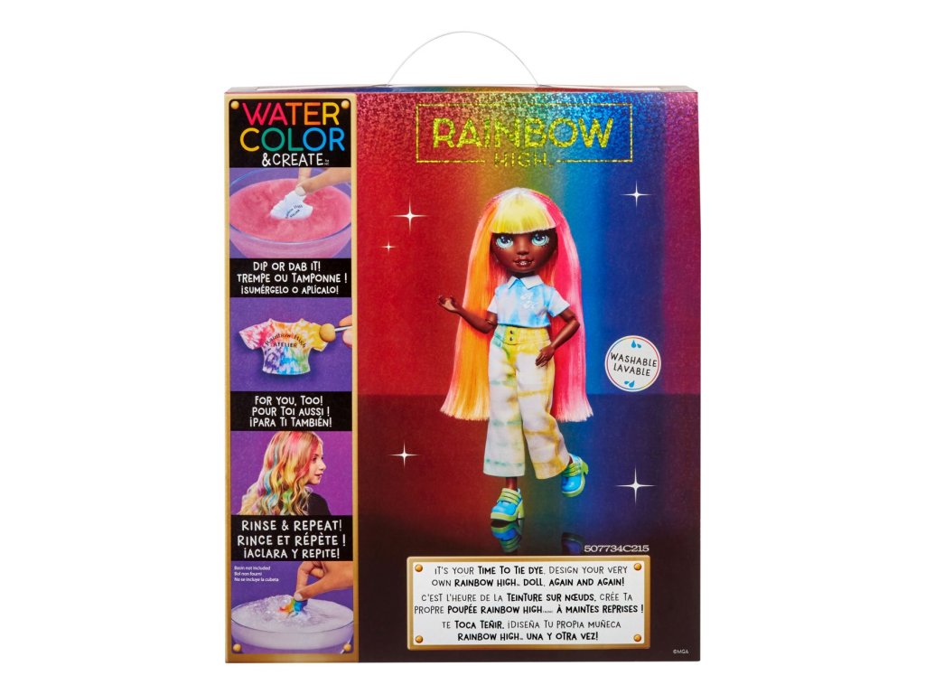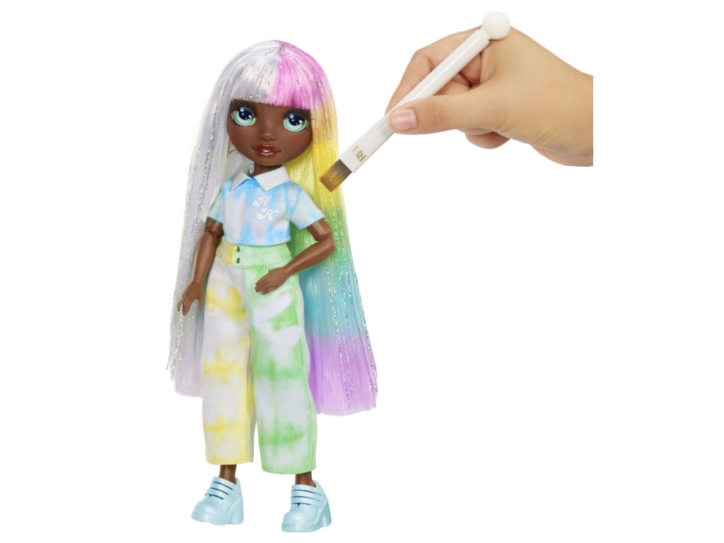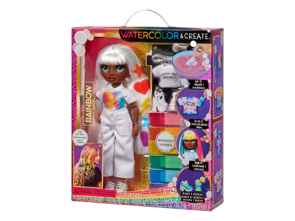 Udělejte si svou vlastní Rainbow High panenku! V balení najdeš panenku s bílými vlasy oblečenou od hlavy k patě do bílé barvy a 6 smývatelných duhových prášků (červený, oranžový, žlutý, zelený, modrý a fialový), gumičky k batikování a aplikační houbičku. Existuje nekonečně mnoho způsobů, jak vybarvit oblečení panenky nebo její vlasy. Po dokončení můžeš panenku opláchnout a vybarvit ji úplně jinak. Prášek nasypeš do vody. Do barevné vody můžeš namočit vlasy a oblečení, nebo houbičku, kterou budeš vytvářet vzory. Pomocí gumiček svaž oblečení a vytvářej různě batikovaný outfit.