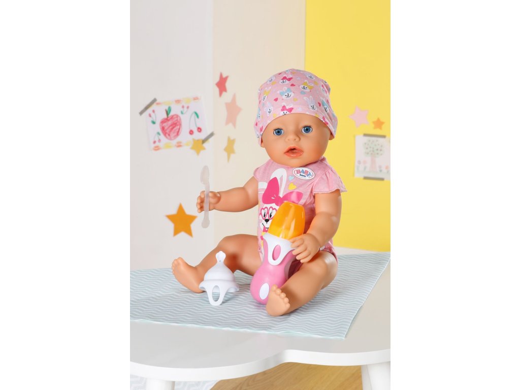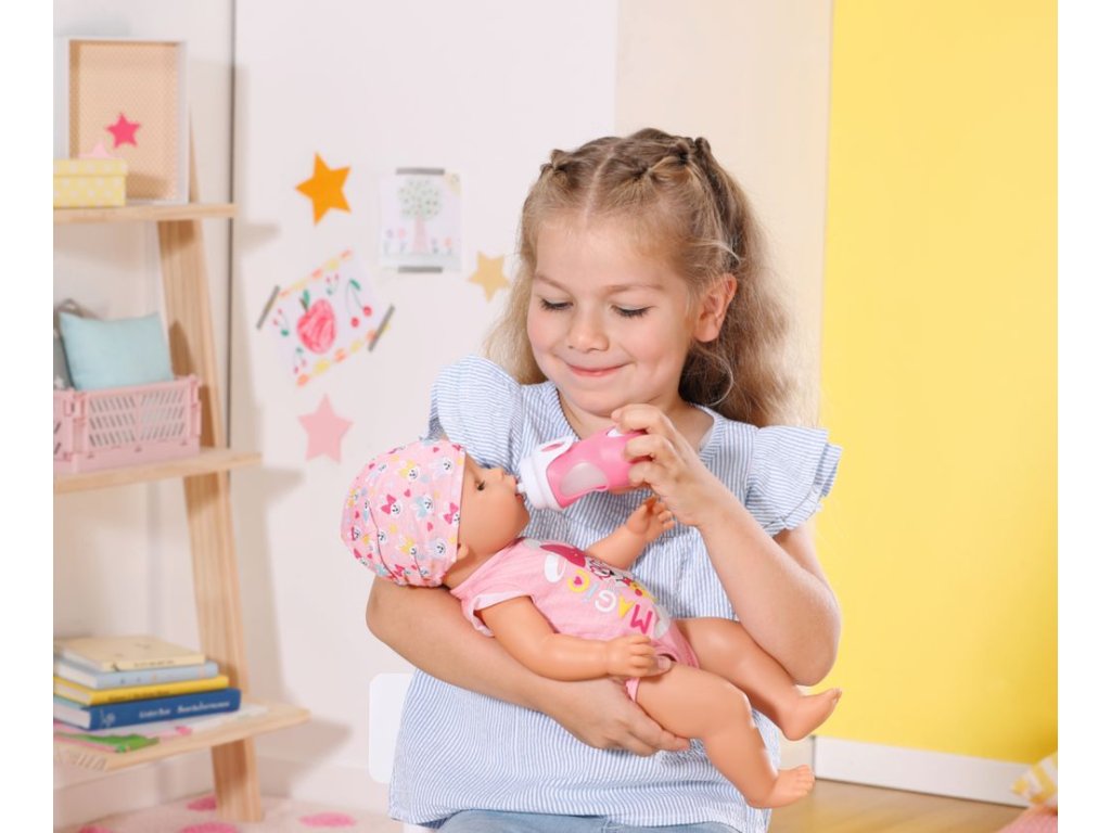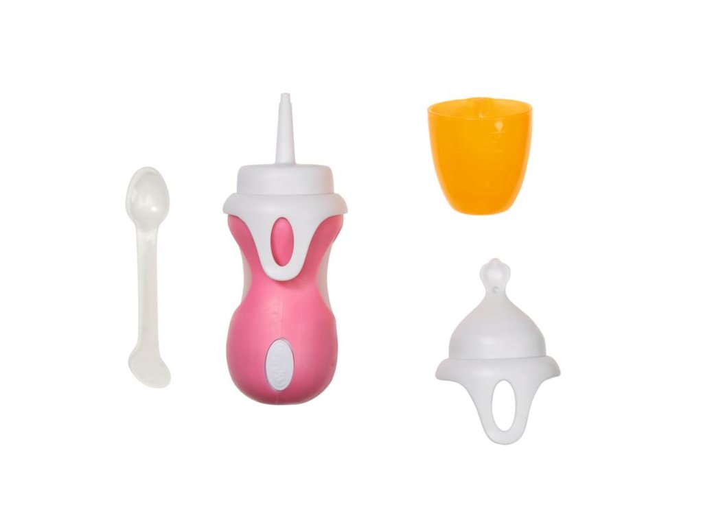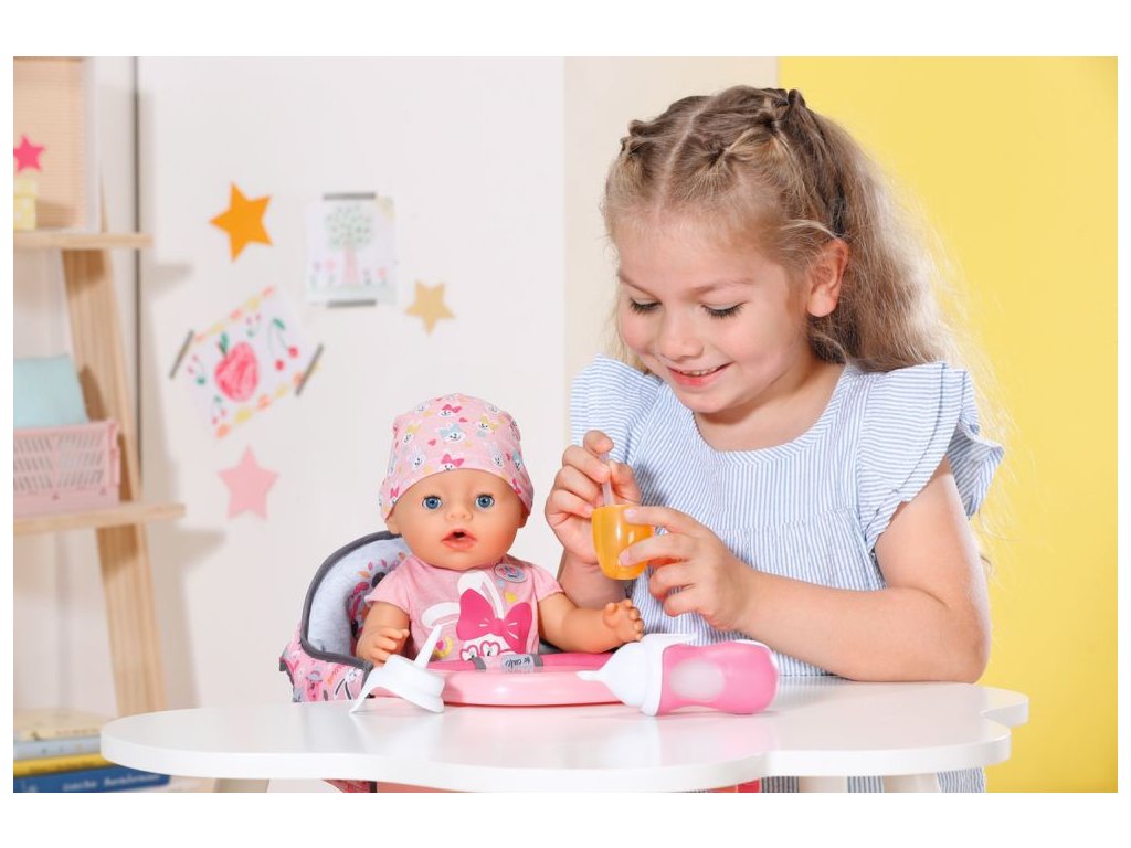 Kdo potřebuje celou kuchyňskou skříň plnou nádobí? Panenka BABY born určitě ne. Má svou lahvičkou s integrovanou lžičkou. Jeden nástavec se používá na pití, při kterém je slyšet zvuk sání. Druhý nástavec je zakončen lžičkou. Kaše pro panenku BABY born se z lahvičky vytlačí otvorem ve spodní části nástavce se lžičkou a vše je připraveno k jídlu. Dobrou chuť!