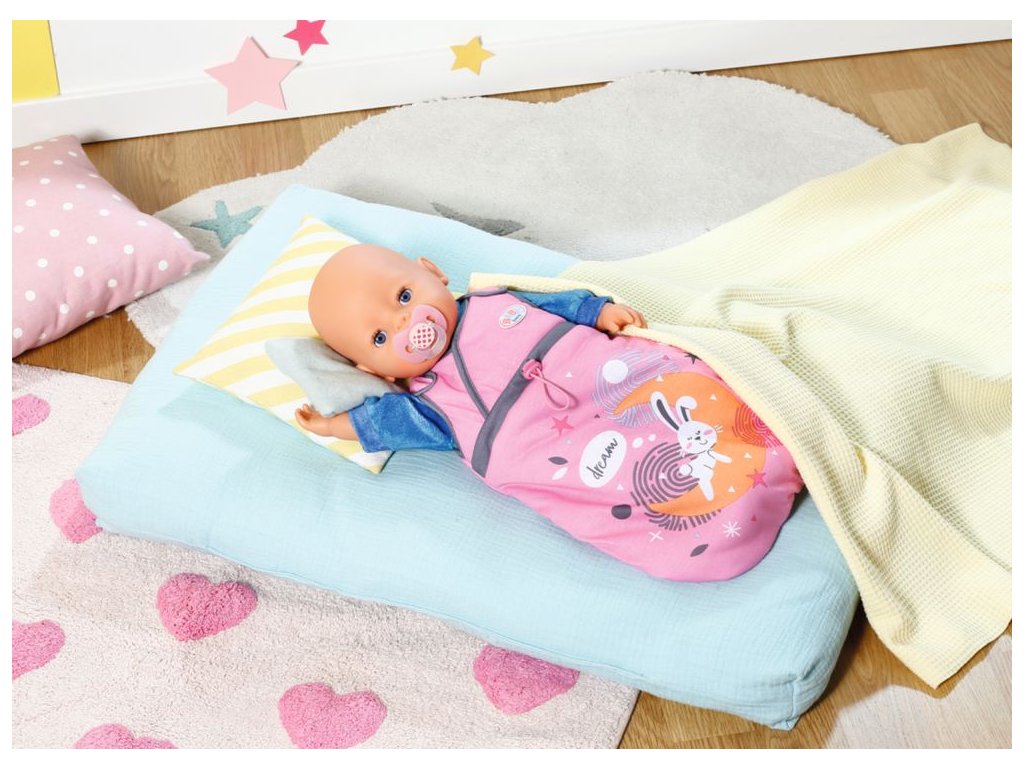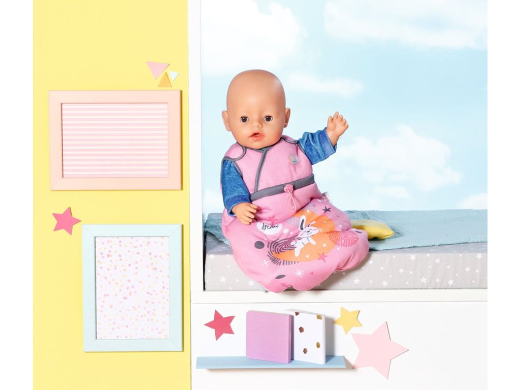„Áách…!“ Už je pozdě, panenka BABY born musí jít rychle spát. V měkoučkém spacím pytli se jí bude skvěle usínat. Na potisku spacího pytle si pohodlně ustlal i zajíček Benno. Dalším nepřehlédnutelným designovým prvkem je šedé lemování. Díky suchému zipu na ramenou lze malého snílka jednoduše vložit do spacího pytle a poté ho zase vytáhnout. Dobrou noc!