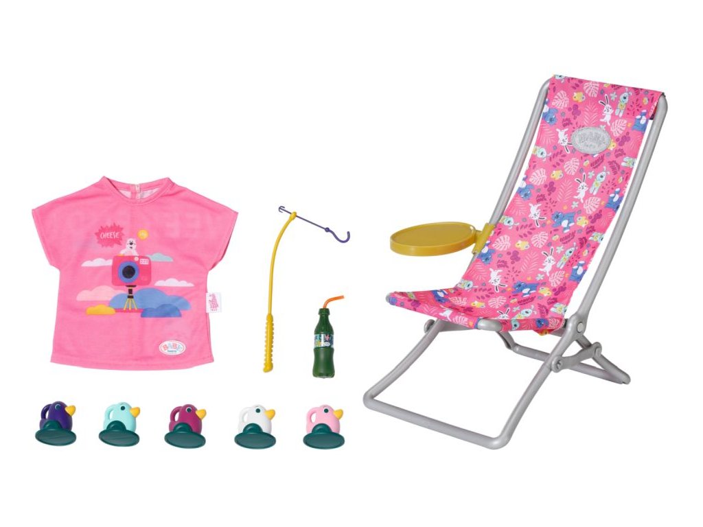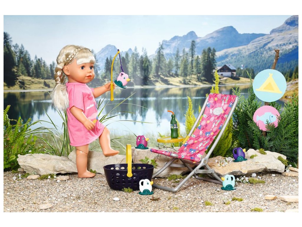 BABY born Víkendová souprava na rybaření obsahuje obleček, lehátko se stolkem, láhev s limonádou, košík, 5 kačenek a rybářský prut.