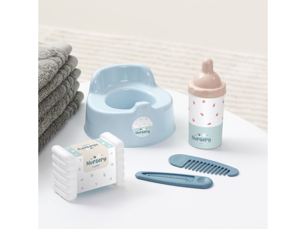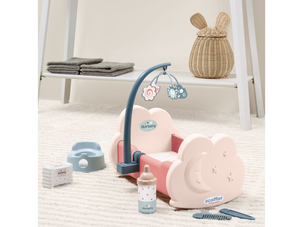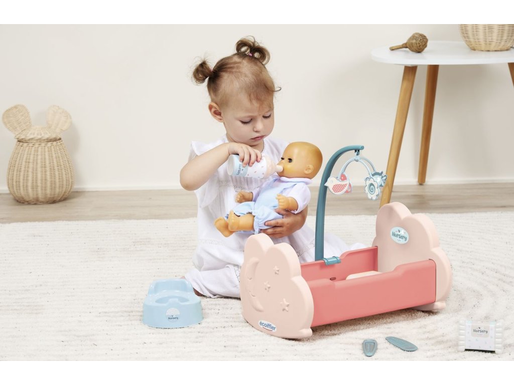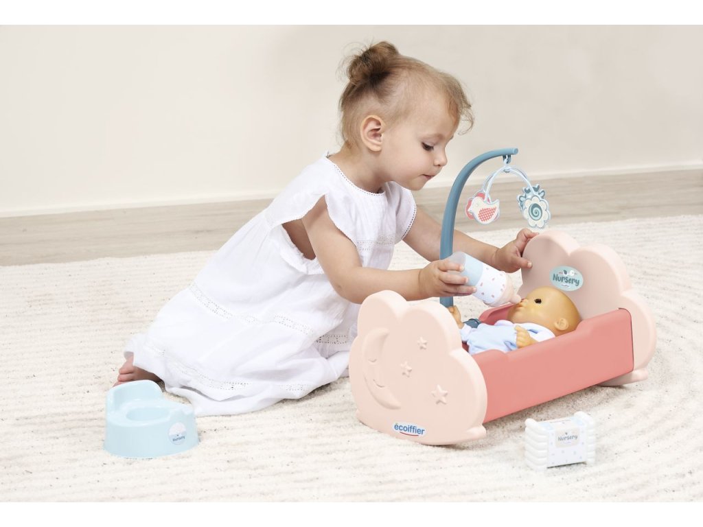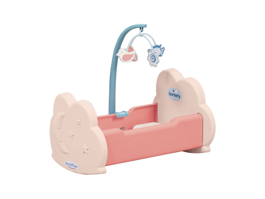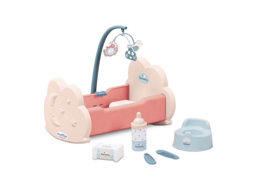 Postýlka pro panenku s příslušenstvím. Součástí je kolotoč nad postýlku, lahvička, nočník, hřeben atd. Rozměry postýlky (DxŠxV): 36 x 27 x 34 cm.