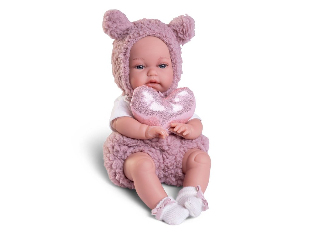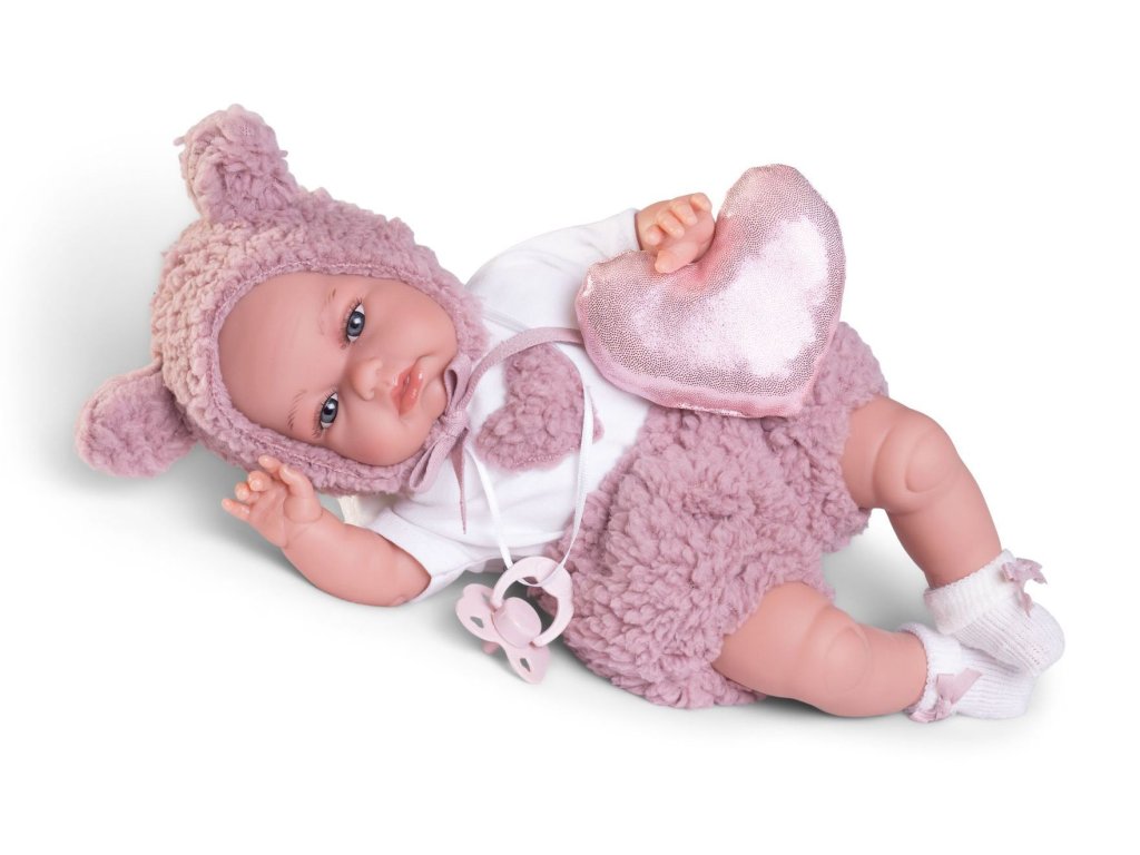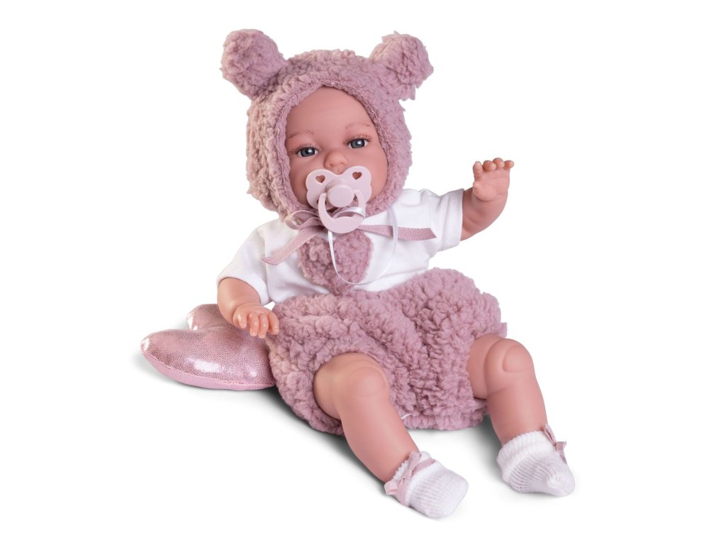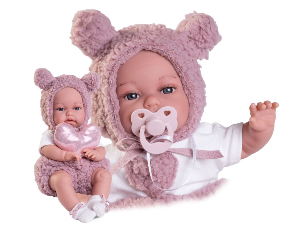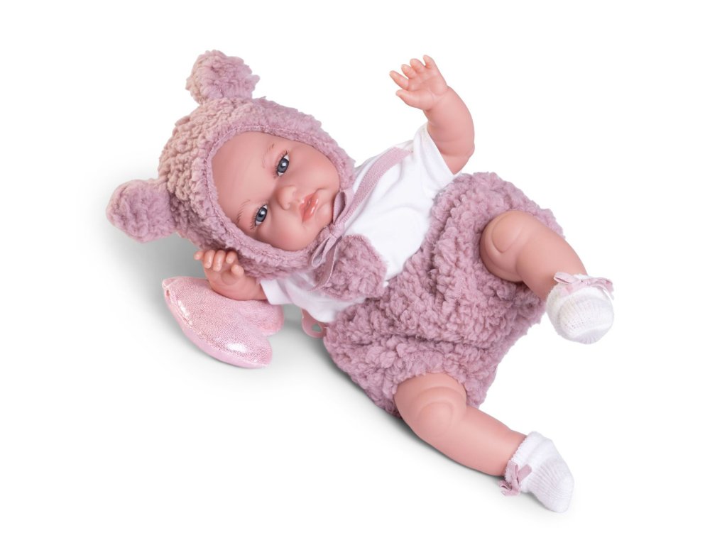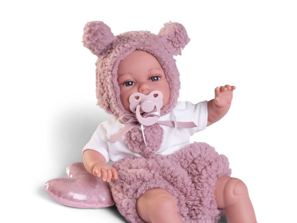Ručně vyrobená realistická španělská panenka - miminko, se speciální pohybovou funkcí. Díky vnitřní opoře kostry těla, může dělat neobvyklé pohyby končetin, jako překřížit nožičky vleže, dát k sobě dlaně nebo zaujmat různé miminkovské polohy. Miminko má měkké látkové tělo, hlava a končetiny jsou vyrobené z kvalitního měkčeného vinylu. Oblečení některých panenek bylo vyrobeno z organické bavlny, která zaručuje výrobu z ručně sbírané, ekologicky bez chemického ošetření pěstované bavlny. Firma Antonio Juan klade velký důraz na ekologii a proto jako první využívá v tomto odvětví zmíněnou bavlnu. Velikost 34 cm. Baleno v dárkové krabici. Doporučený věk od 3 let.