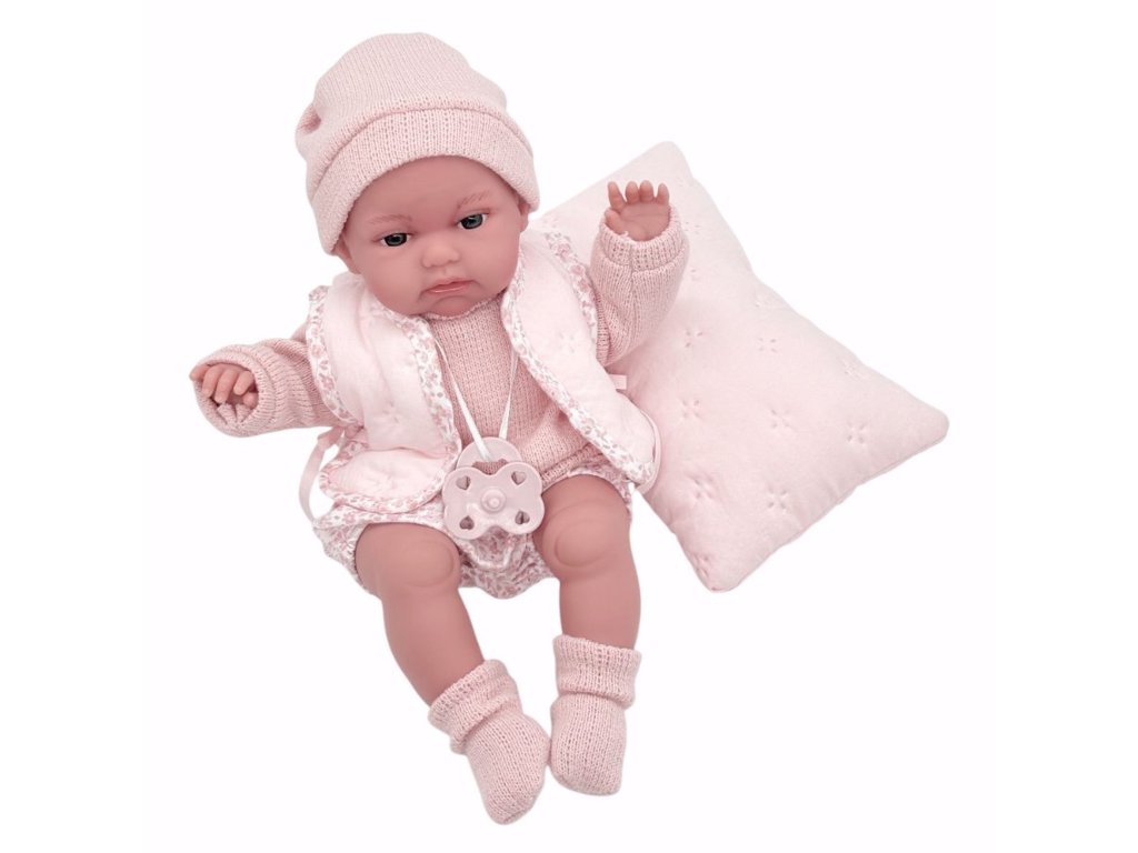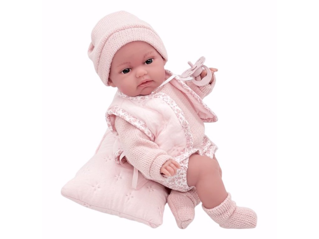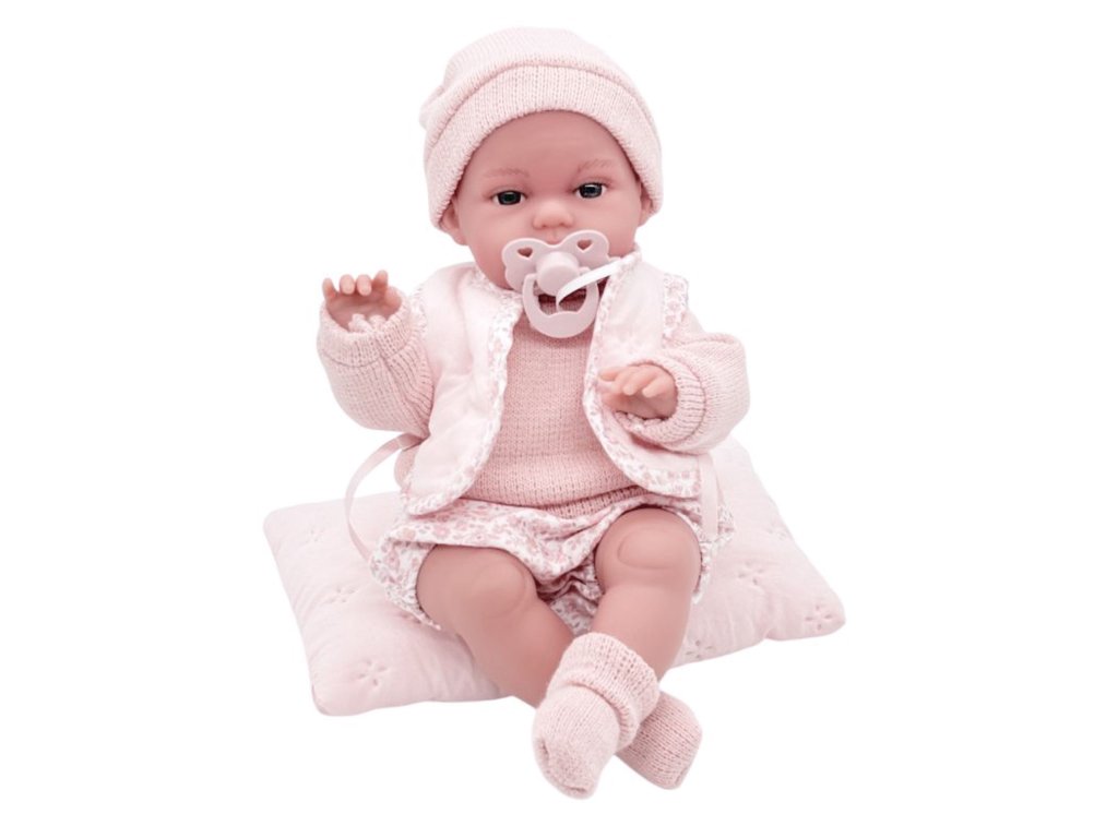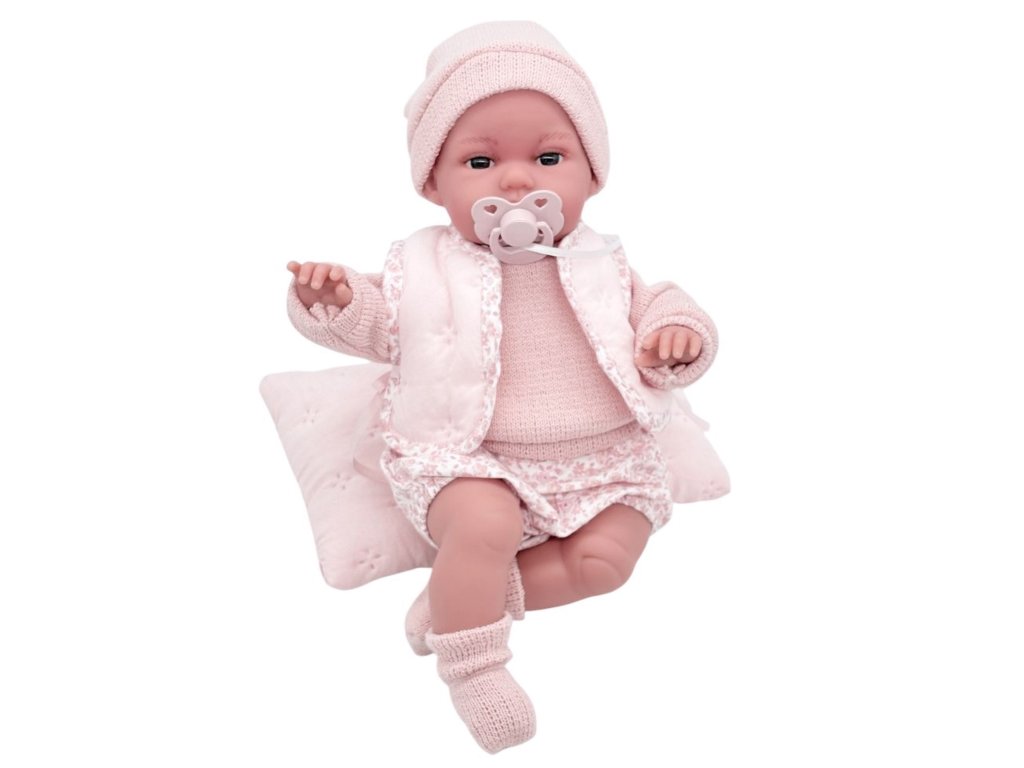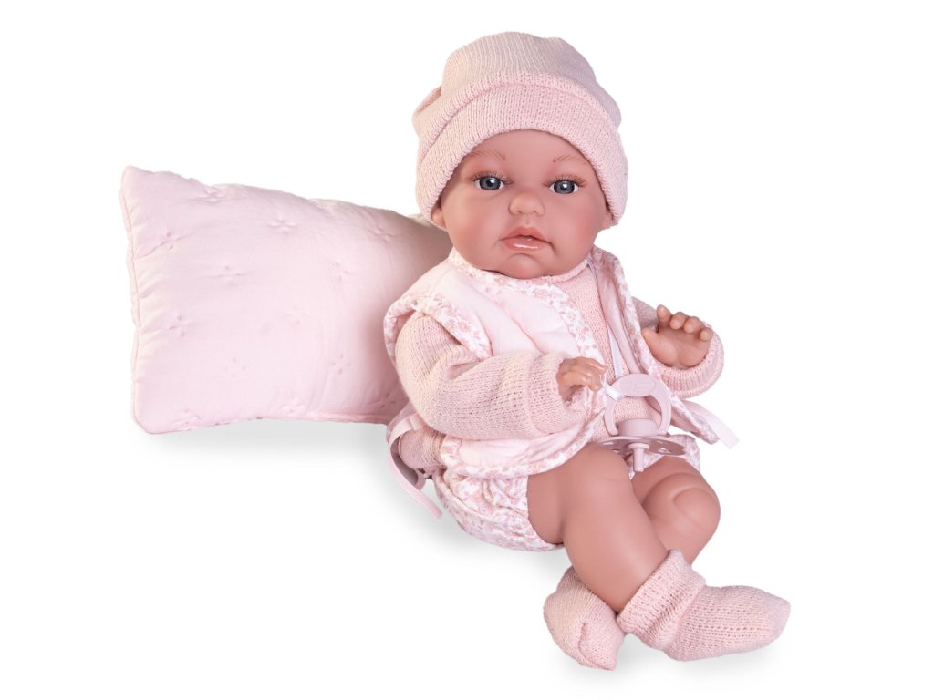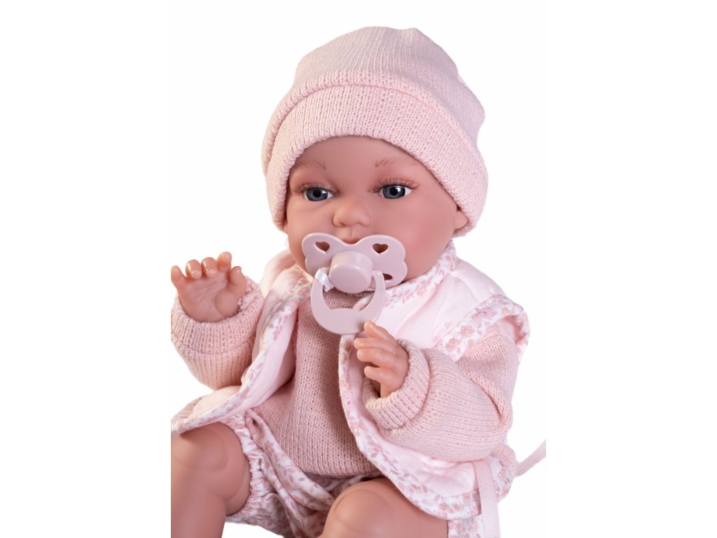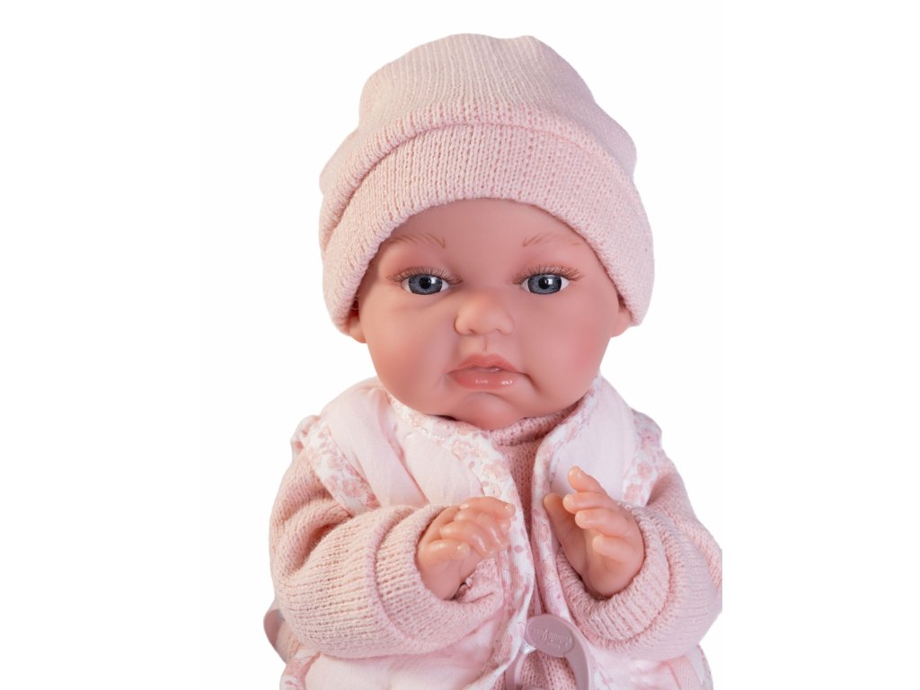 Ručně vyrobená realistická španělská panenka - miminko, se speciální pohybovou funkcí. Díky vnitřní opoře kostry těla, může dělat neobvyklé pohyby končetin, jako překřížit nožičky vleže, dát k sobě dlaně nebo zaujmat různé miminkovské polohy. Miminko má měkké látkové tělo, hlava a končetiny jsou vyrobené z kvalitního měkčeného vinylu. Oblečení některých panenek bylo vyrobeno z organické bavlny, která zaručuje výrobu z ručně sbírané, ekologicky bez chemického ošetření pěstované bavlny. Firma Antonio Juan klade velký důraz na ekologii a proto jako první využívá v tomto odvětví zmíněnou bavlnu. Velikost 34 cm. Baleno v dárkové krabici. Doporučený věk od 3 let.