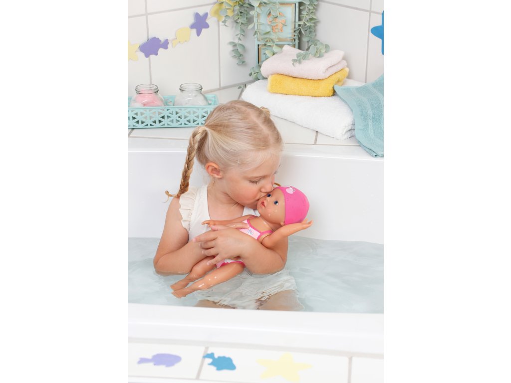 Malá holčička už se toho na hodině plavání tolik naučila. Nejraději má kraul a motýlka. Když plave kraul, střídá ve vodě jednu ruku za druhou, u motýlka rukama hýbe nastejno. A vše bez baterií! Stačí panence natáhnout ruce dozadu a je připravena na další kolo. Když jí ruce uvolníš, začne ve vodě plavat. Nohy a hlava „malého delfína“ jsou také pohyblivé, takže Plaváček může sedět na okraji bazénu a pozorovat svou maminku a tatínka. Plavací čepice a roztomilé plavky s motivem kačenky Berty a s legračními volánky jsou natištěny přímo na těle panenky jako reliéf.