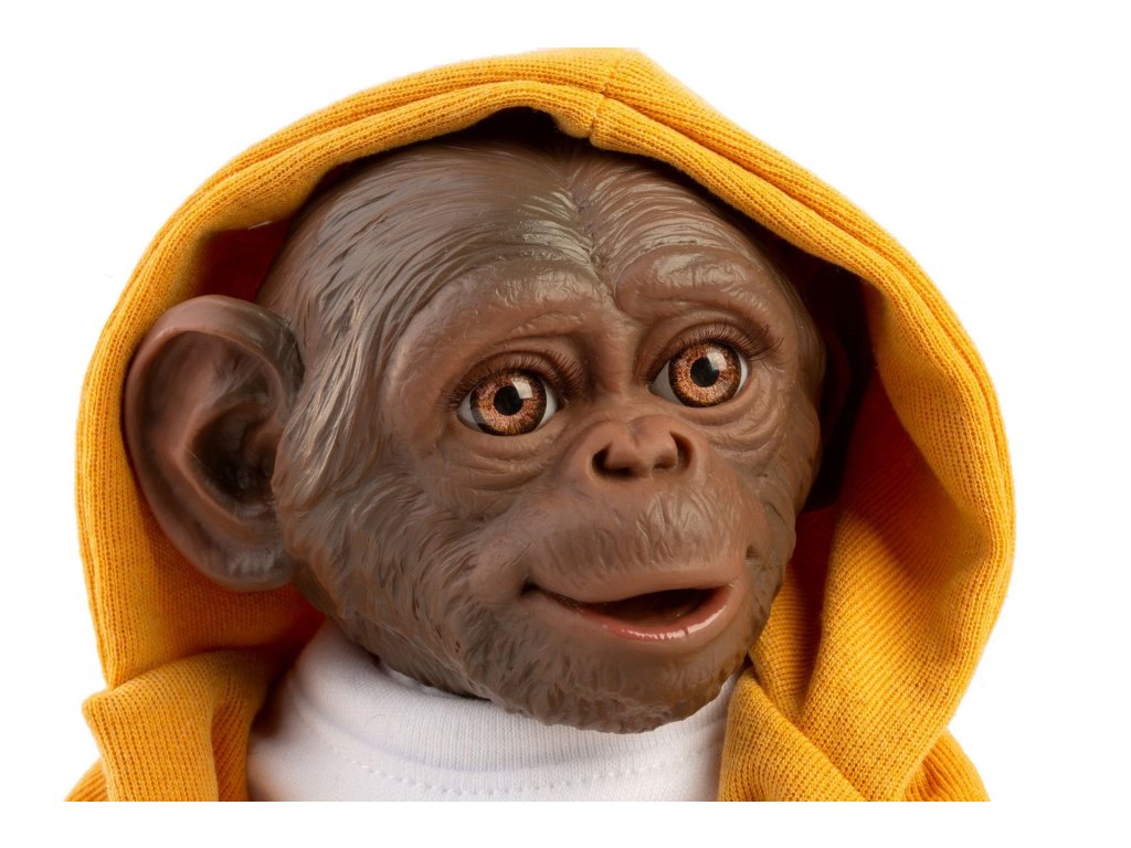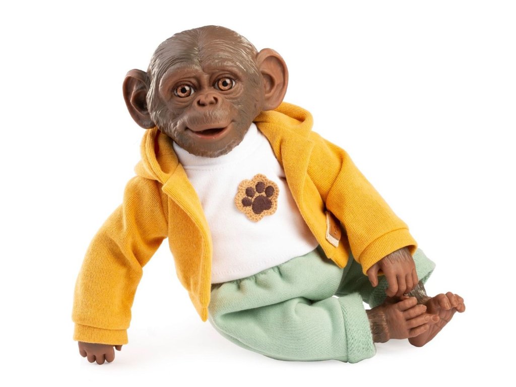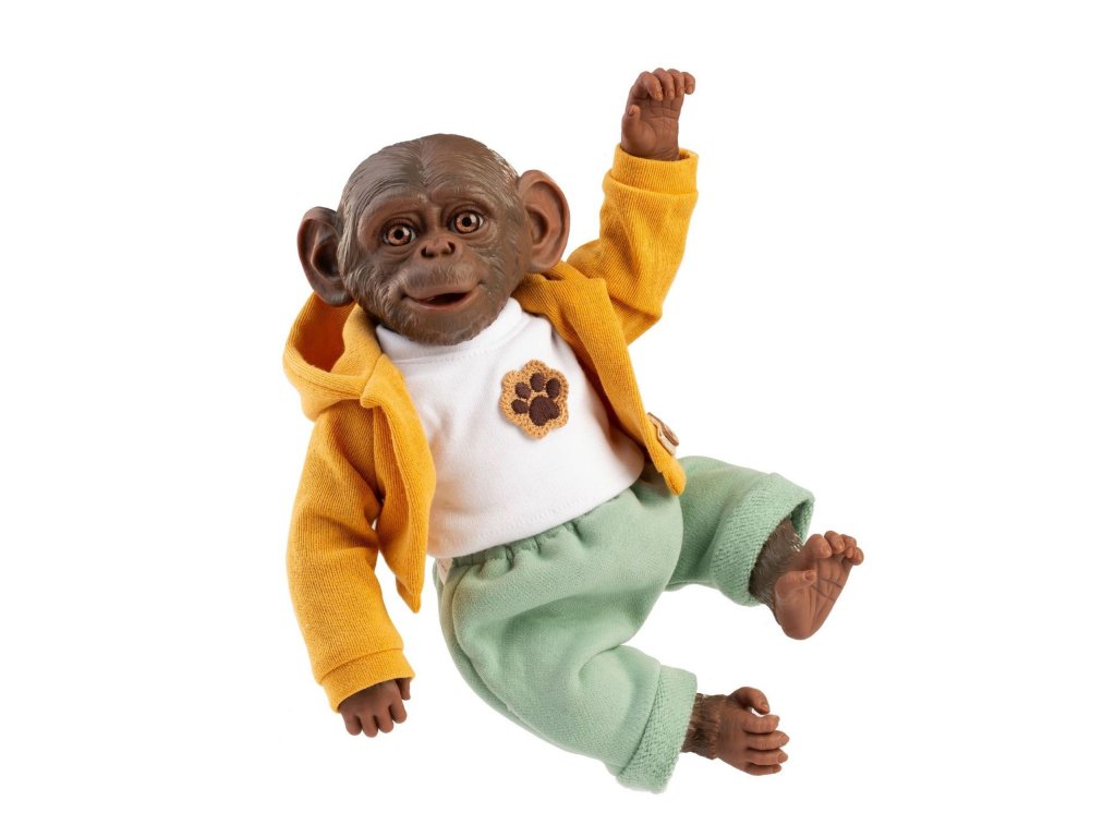 Veselé a roztomilé opičí miminko bez zvuku s měkkým látkovým tělem. Hlava a končetiny jsou vyrobené z kvalitního vinylu. Ruce a nohy jsou k tělu přichyceny kloubem. Opičí miminko je polohovací a může i sedět nebo se dá pověsit za ruce nebo nohy. Velikost 32 cm. Ručně vyrobeno ve Španělsku, baleno v dárkové krabici. Doporučený věk od 3 let.