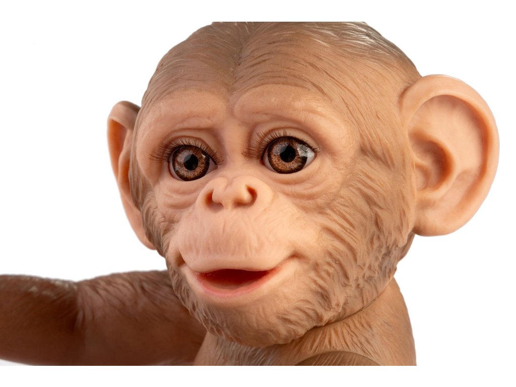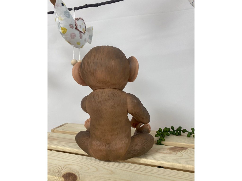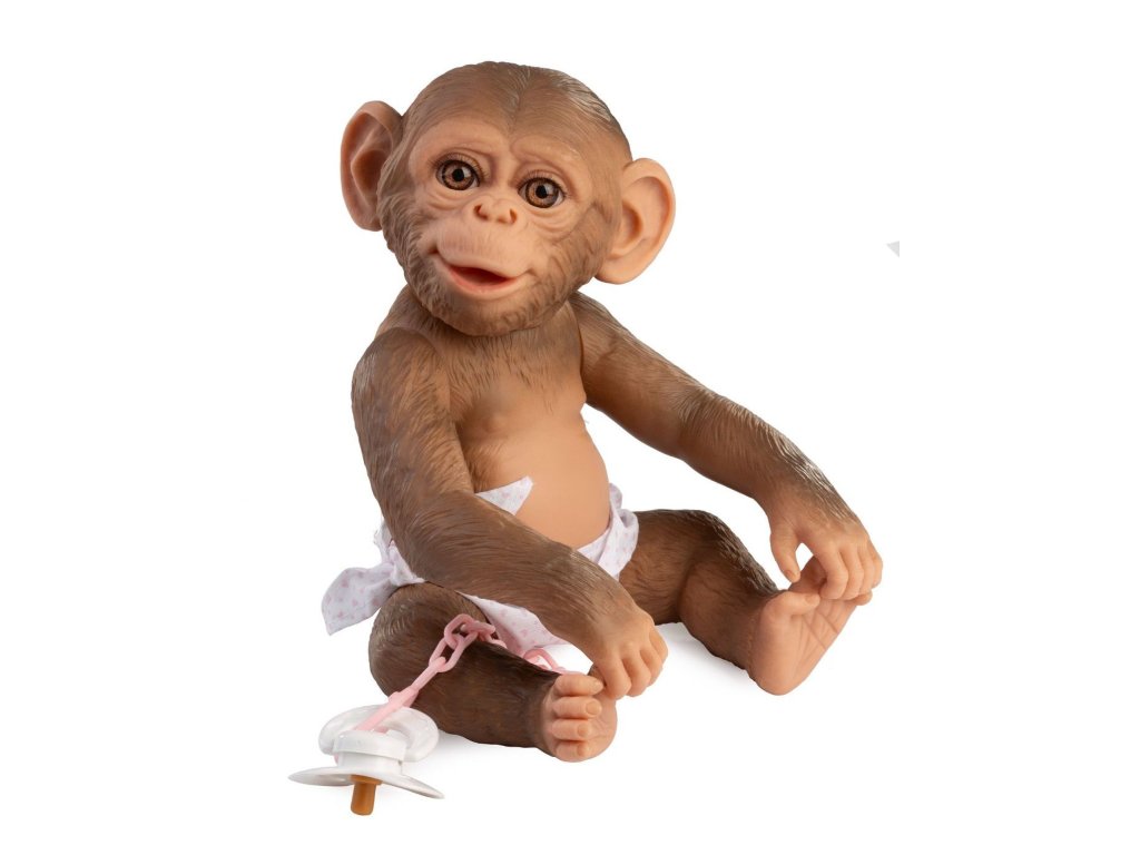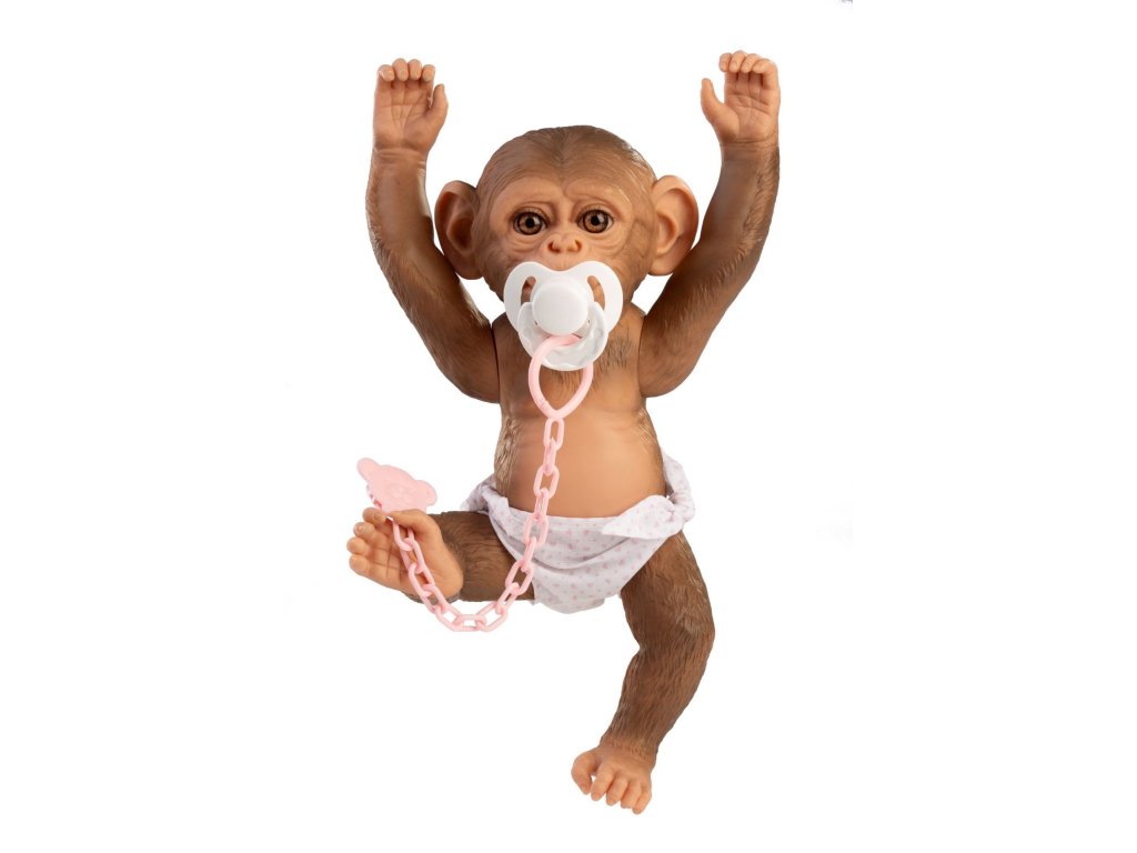 Veselé a roztomilé opičí miminko bez zvuku s vinylovým tělem s možností koupání, na kterém je zachycen věrohodně každý detail tohoto zvířecího mláďátka včetně různých záhybů, kromě pohlaví. Opičku lze koupat, ale je potřeba dát pozor, aby se jí nenamočily řasy. Odlepené řasy nejsou pak důvodem k reklamaci. Ruce a nohy jsou k tělu přichycené kloubem. Opičí miminko je polohovací a může i sedět nebo se dá pověsit za ruce nebo nohy. Dudlík v balení slouží pouze jako doplněk. Velikost 32 cm. Ručně vyrobeno ve Španělsku, baleno v dárkové krabici. Doporučený věk od 3 let.