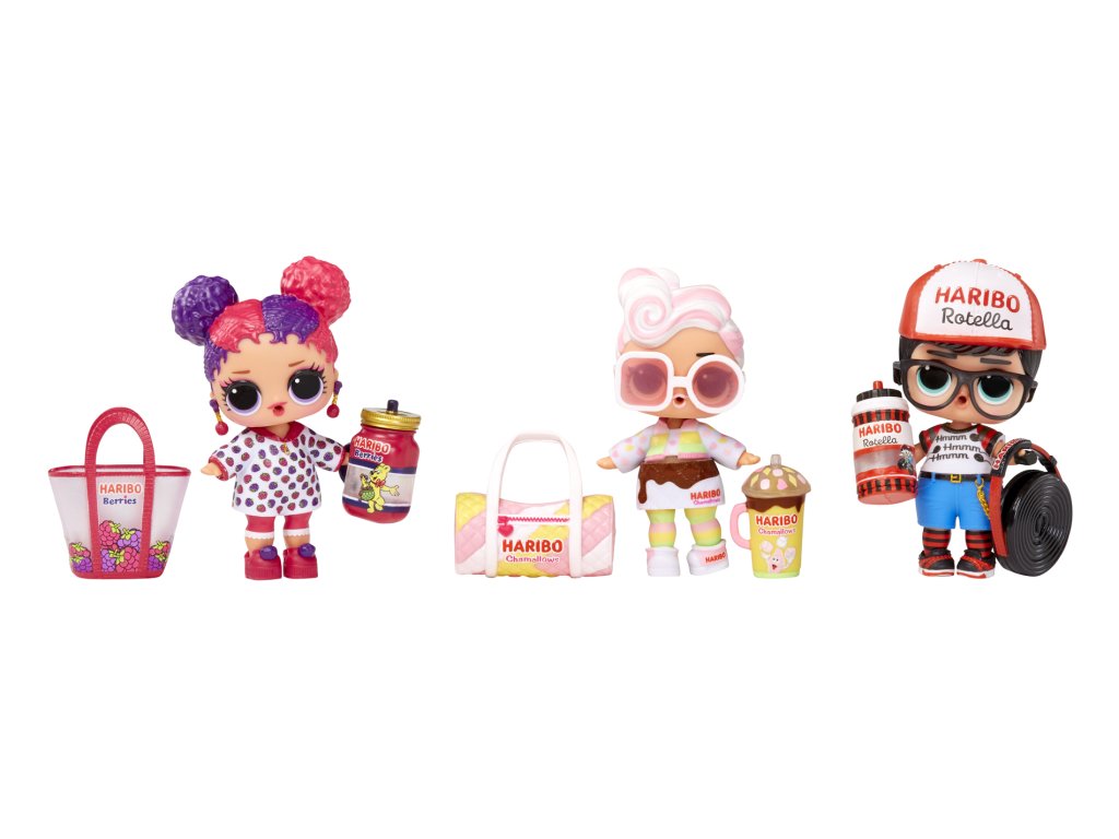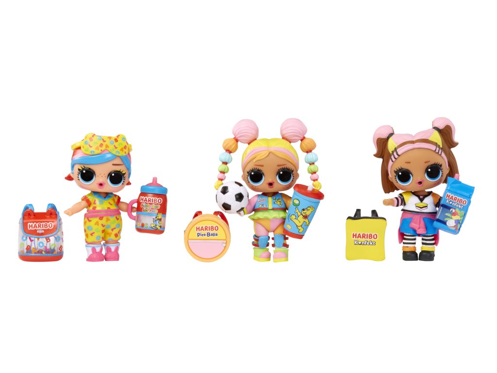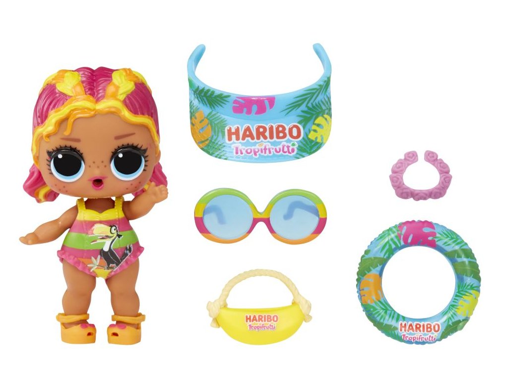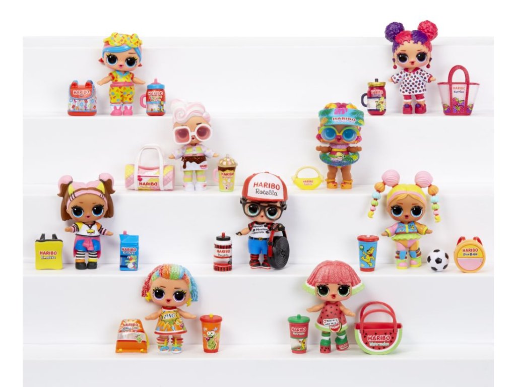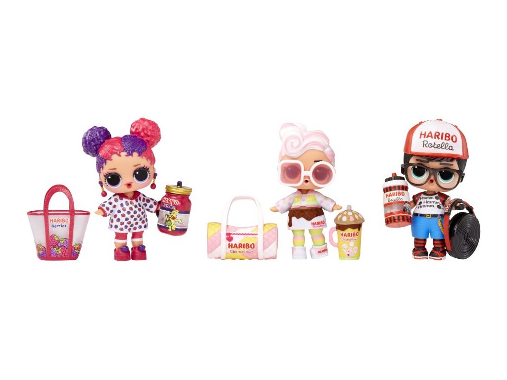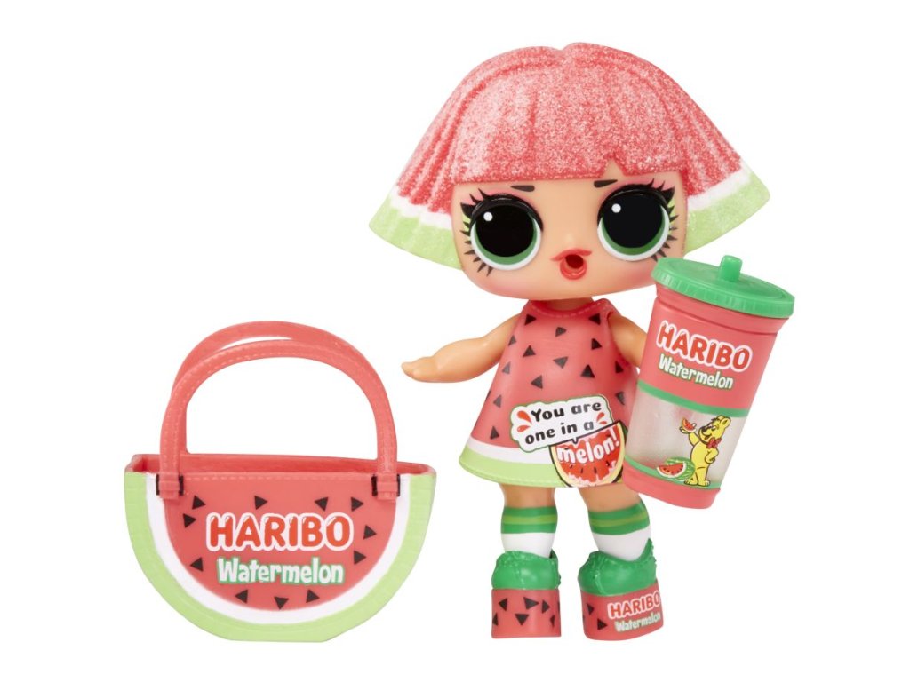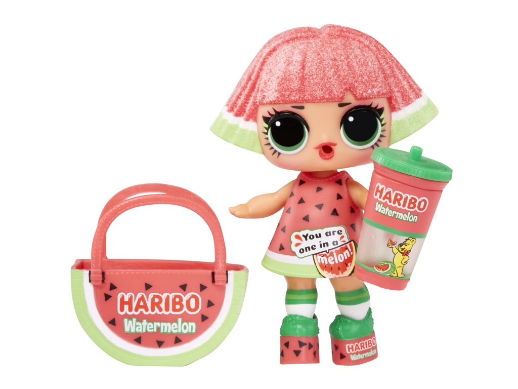 L.O.L. Surprise! se spojilo s ikonickým výrobcem sladkostí a společně s Haribo vám přináší panenky, jejichž doplňky jsou inspirované Haribo sladkostmi. Když dáš panence napít, některá bude plivat vodu.Obsah balení:?• 1 panenka• 1 – 2 módní doplňky• 1 pár bot• 0 – 1 lahvička• 0 – 4 doplňkyVelikost L.O.L. panenky: cca 8 cm.