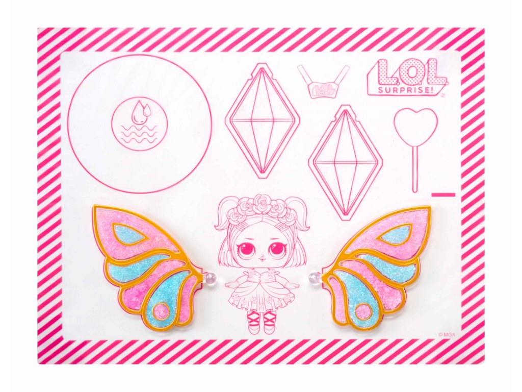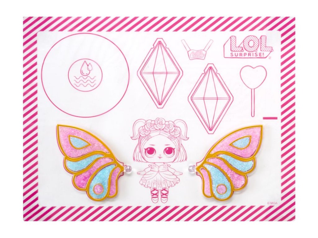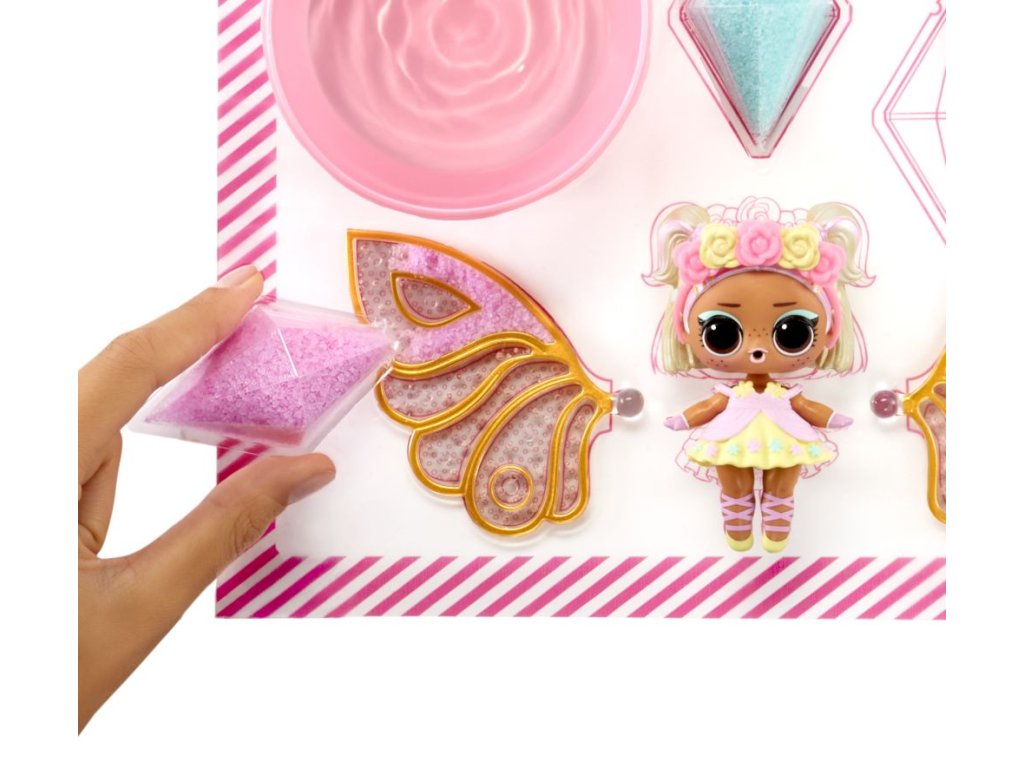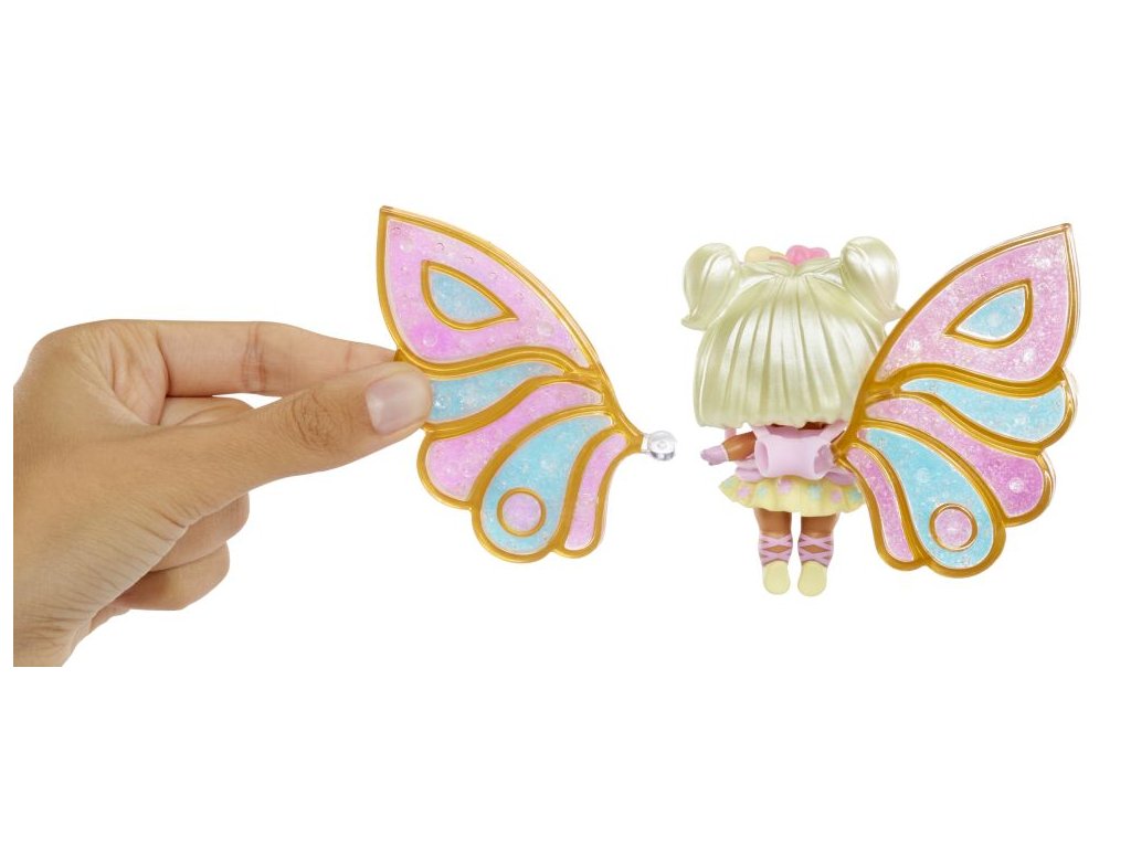 Pomůžeš L.O.L. Surprise! panenkám proměnit se v malé víly? Panenka potřebuje vyrobit křídla v několika jednoduchých krocích. Polož křídla na rovnou podložku.Nasypej barevný vílí prach do křídel (použij svou představivost a kreativitu).Pipetou z balení nakapej vodu do křídel.Počkej, až křídla uschnou, a připni je panence na záda.Obsah balení:?1 panenka1 pár křídel3 různé barvy vílího prachu do křídel1 pipetaoutfit a vílí doplňkyV sérii můžeš sesbírat 8 panenek. Obal slouží jako stojánek pro vystavení víly.