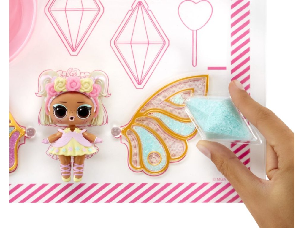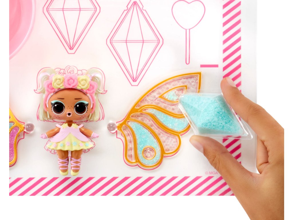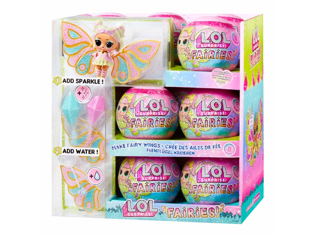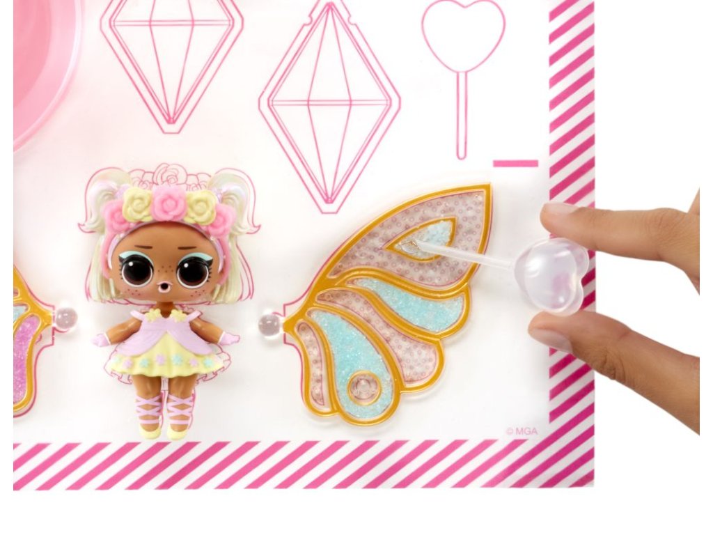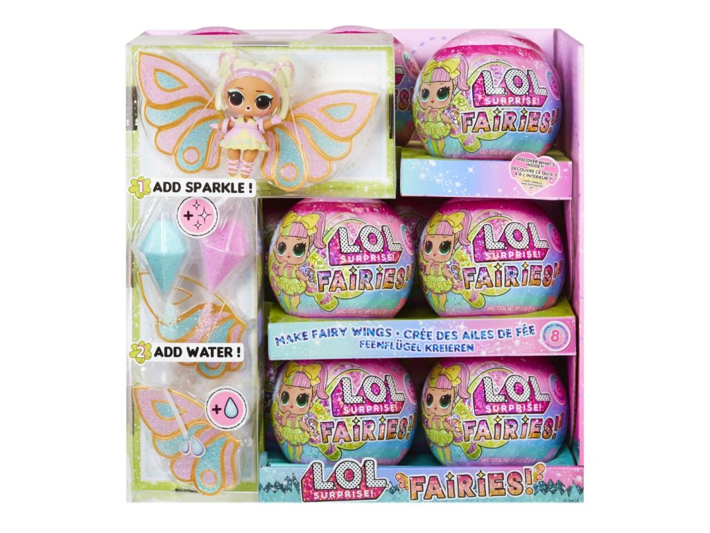 Pomůžeš L.O.L. Surprise! panenkám proměnit se v malé víly? Panenka potřebuje vyrobit křídla v několika jednoduchých krocích. Polož křídla na rovnou podložku.Nasypej barevný vílí prach do křídel (použij svou představivost a kreativitu).Pipetou z balení nakapej vodu do křídel.Počkej, až křídla uschnou, a připni je panence na záda.Obsah balení:?1 panenka1 pár křídel3 různé barvy vílího prachu do křídel1 pipetaoutfit a vílí doplňkyV sérii můžeš sesbírat 8 panenek. Obal slouží jako stojánek pro vystavení víly.
