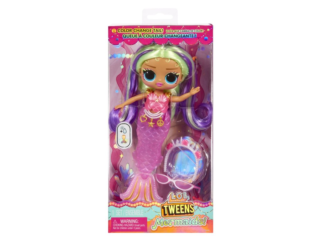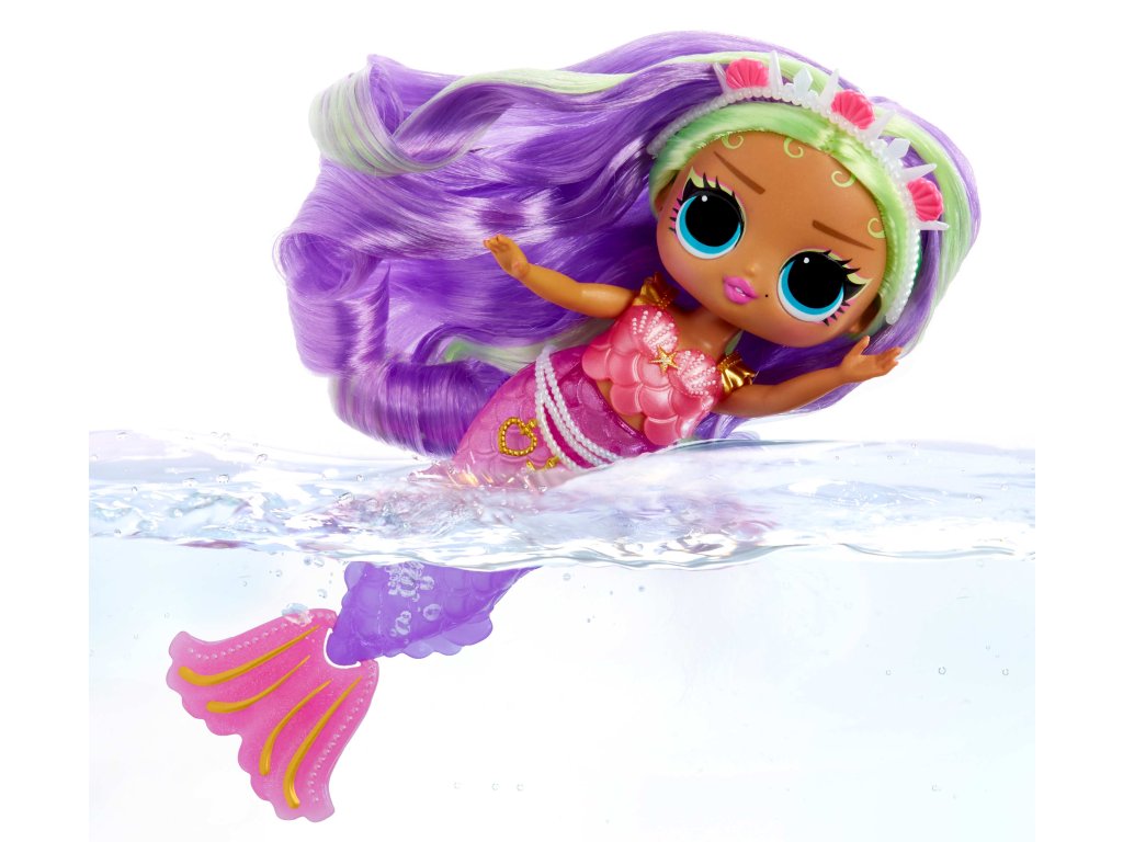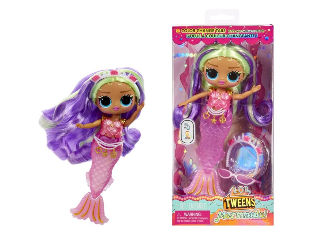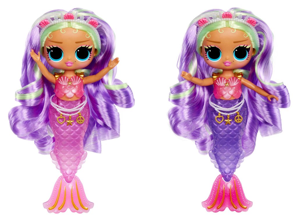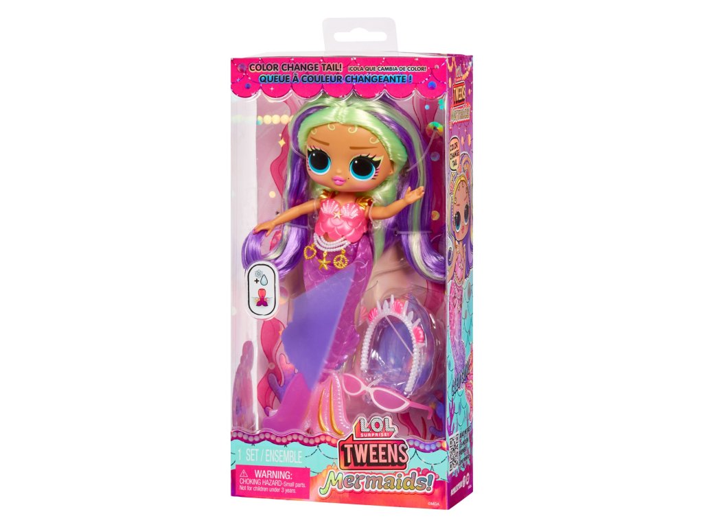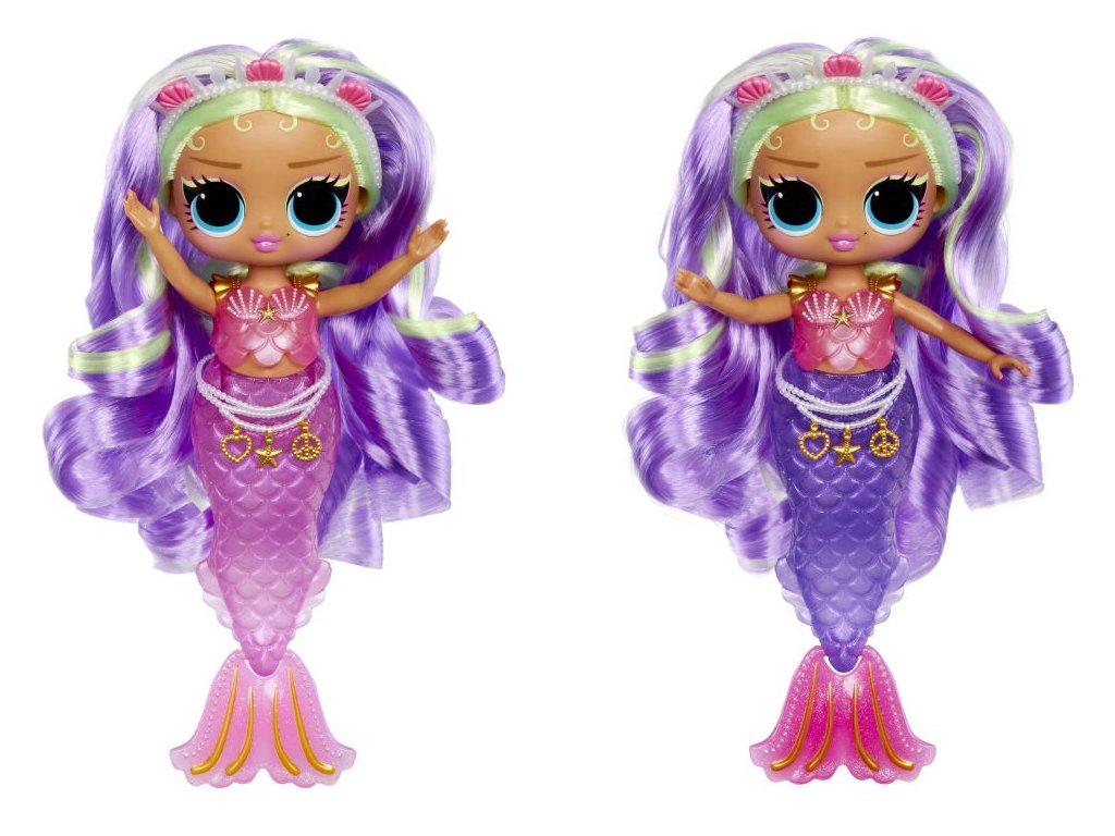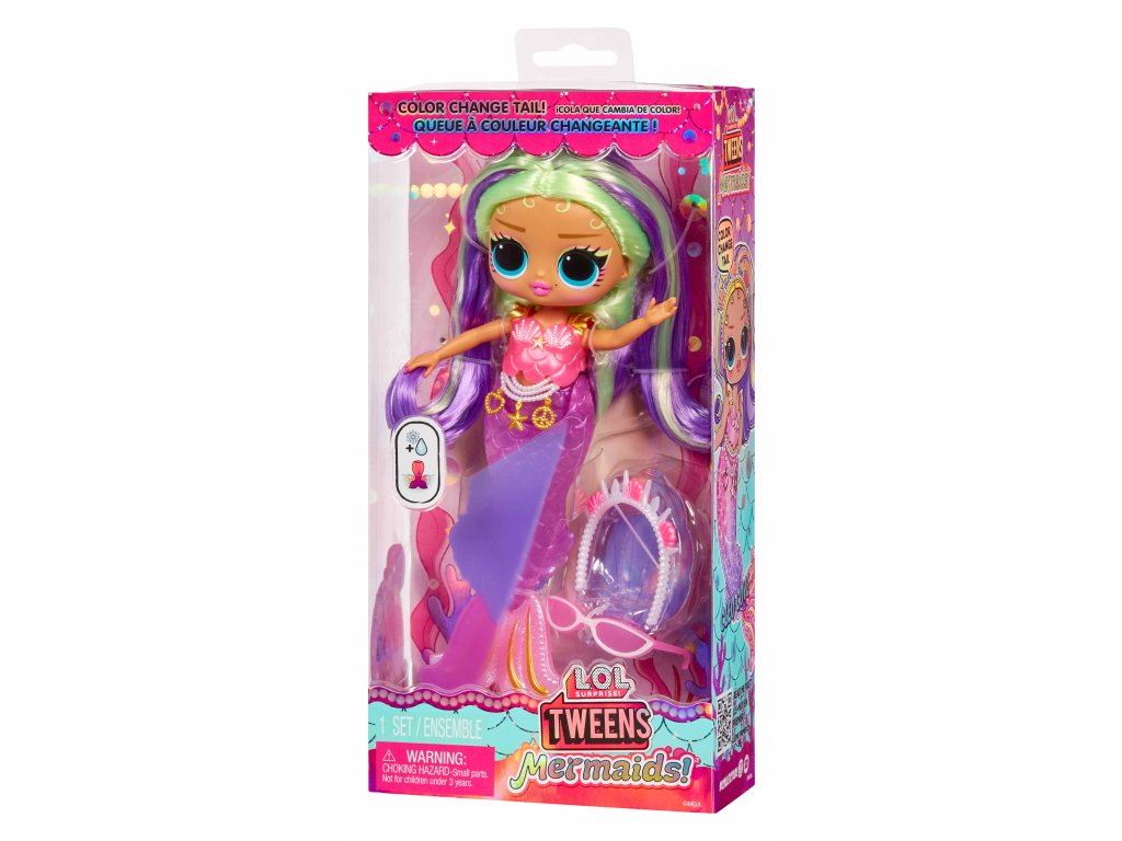 Představujeme 4 nové L.O.L. Surprise! Tweens rošťácké panenky, které se přeměnily na mořské panny s nádherně barevnou ploutví, která mění barvu, když ji ponoříš do ledové vody. Panenka dokáže na ploutvi stát. V balení najdeš spoustu tematických doplňků.