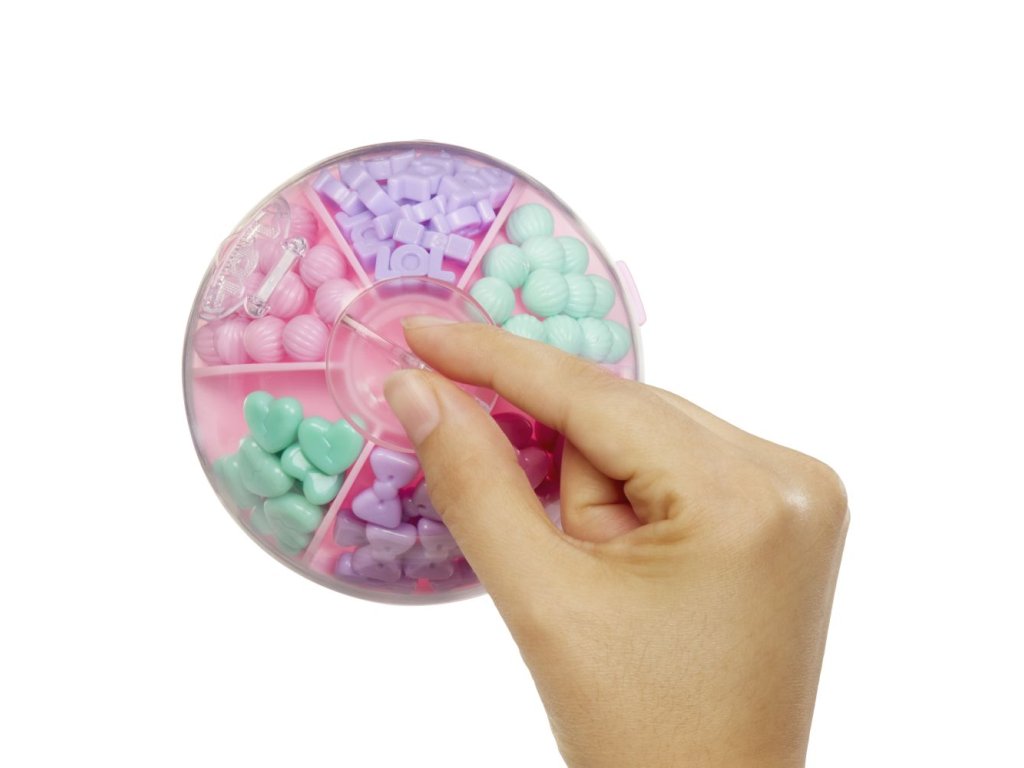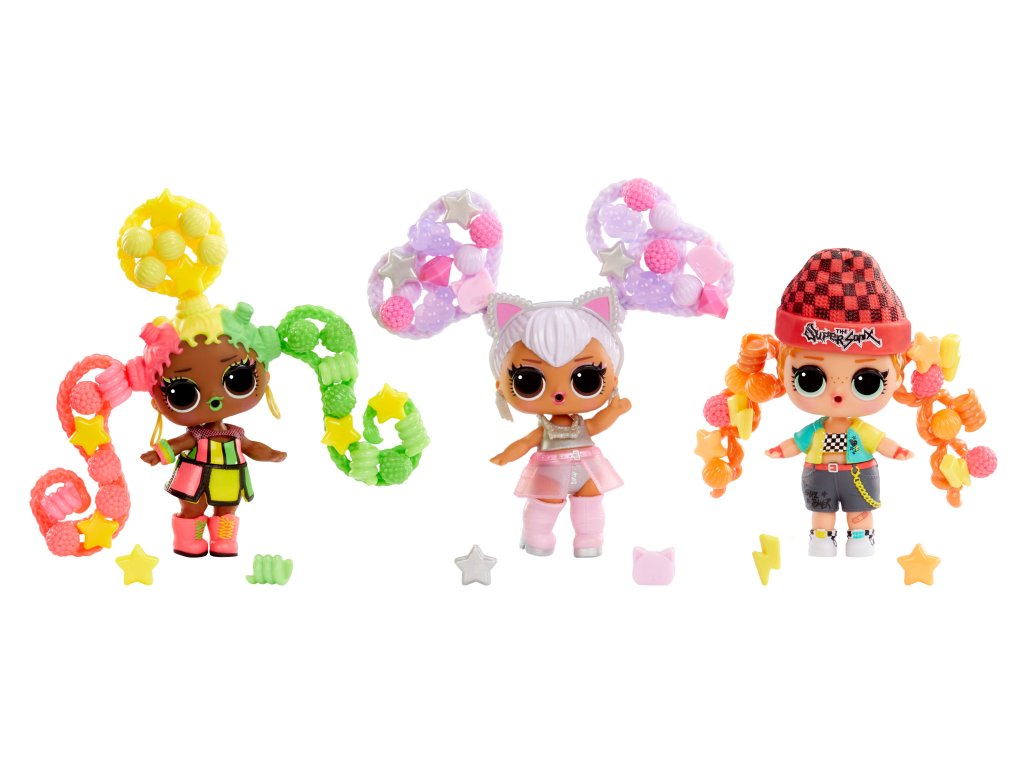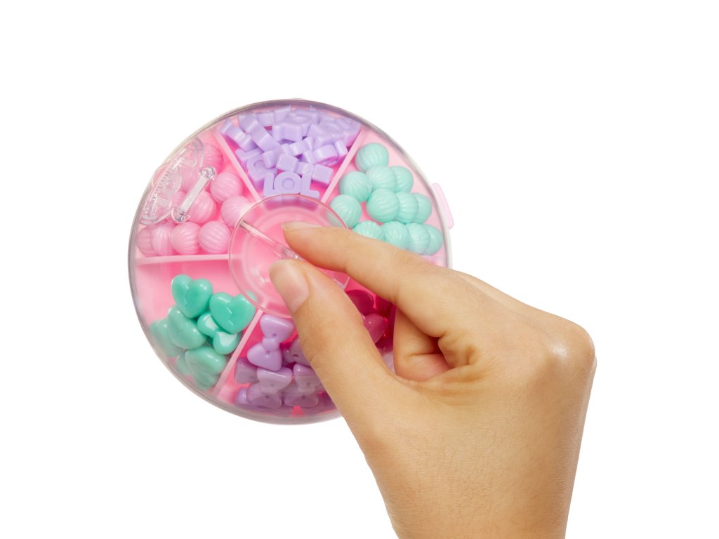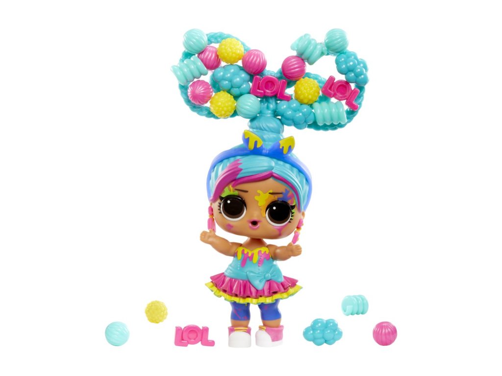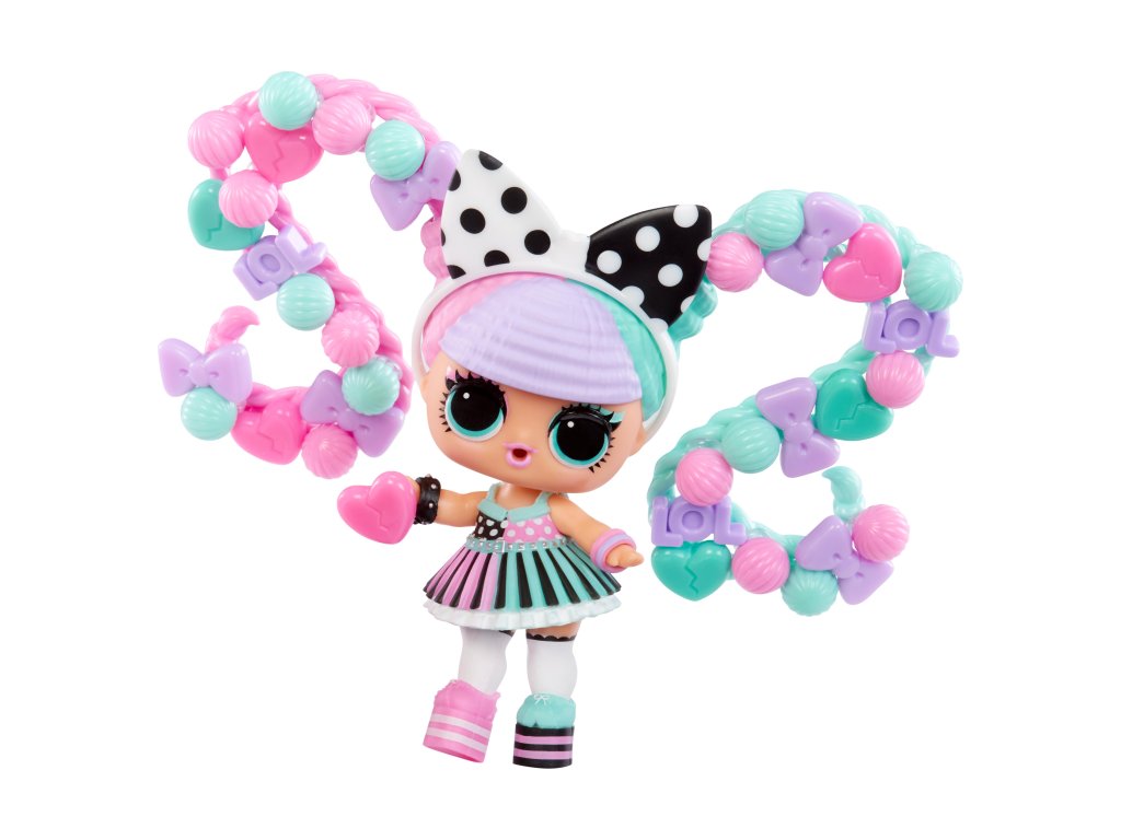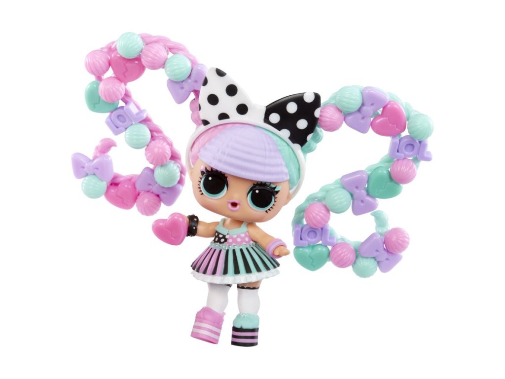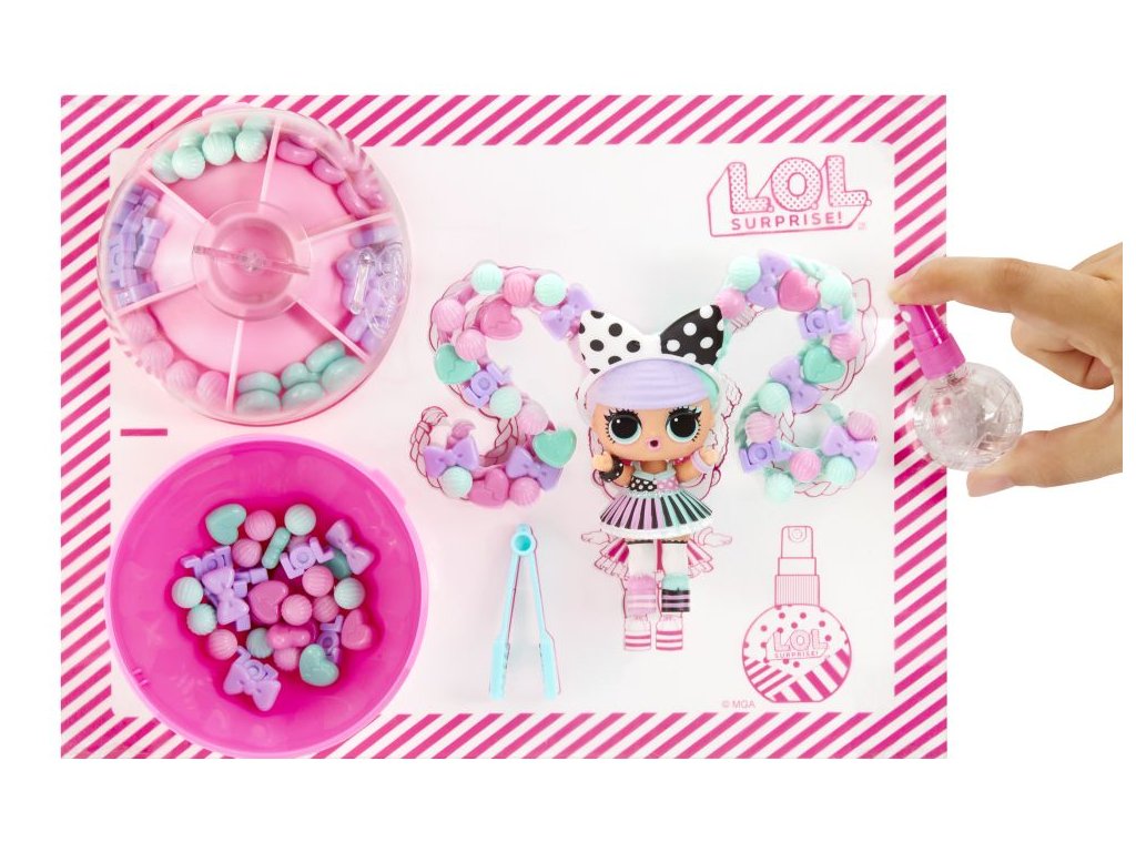 Vytvářej barevné, rozpustilé účesy L.O.L. panenkám. V balení najdeš obrovské množství korálků, ze kterých vytvoříš culíčky, copánky nebo třeba drdůlky. Panence stačí vsadit do drdolu pramen vlasů, předem ho namočit na chvilku do vody, a už můžeš korálky skládat. Rozprašovačem z balení navlhčíš hotový účes a necháš ztvrdnout. Když se účes nelíbí, můžeš korálky rozebrat a vytvořit jiný. Prameny vlasů i korálky je možné v této sérii mezi panenkami měnit.
