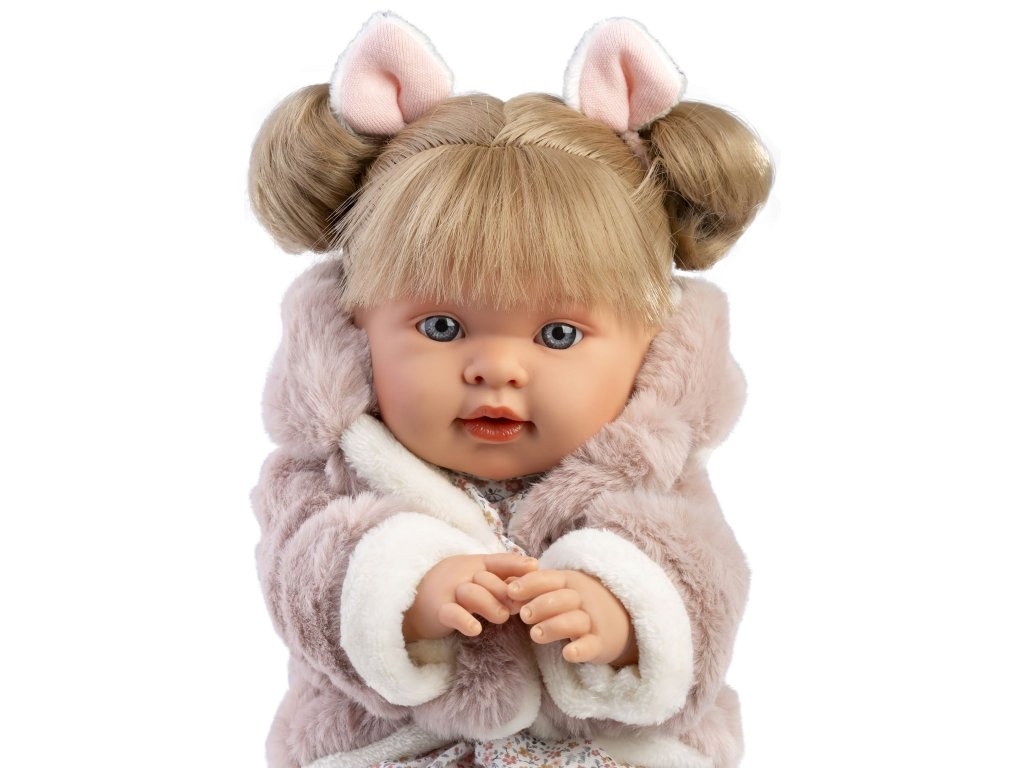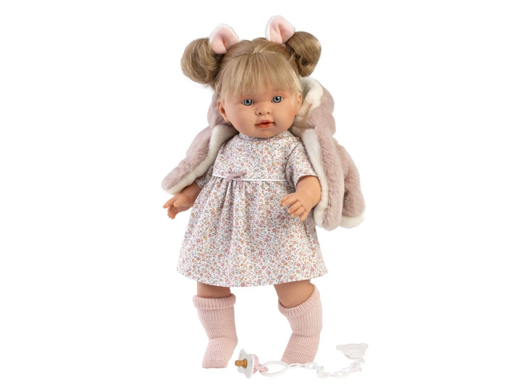 Mluvící a plačící panenka (po vyjmutí pojistky ihned funkční) s měkkým látkovým tělem a s vlásky po celé hlavě. Hlava a končetiny jsou vyrobené z kvalitního měkčeného vinylu. Po vytažení dudlíku z úst začne panenka říkat „mama“, „papa“ a vydávat reálný zvuk plačícího dítěte, který lze utišit opět magnetickým dudlíkem. Velikost panenky 42 cm. Ručně vyrobeno ve Španělsku, baleno v dárkové krabici. Doporučený věk od 3 let. K panence je možné dokoupit další originální oblečení z nabídky Llorens pro panenky velikosti 42 cm. Součástí balení je 3 x knoflíková baterie LR44 s návodem na její výměnu. Baterie jsou spotřební zboží a proto jejich vybití není důvodem k reklamaci panenky.