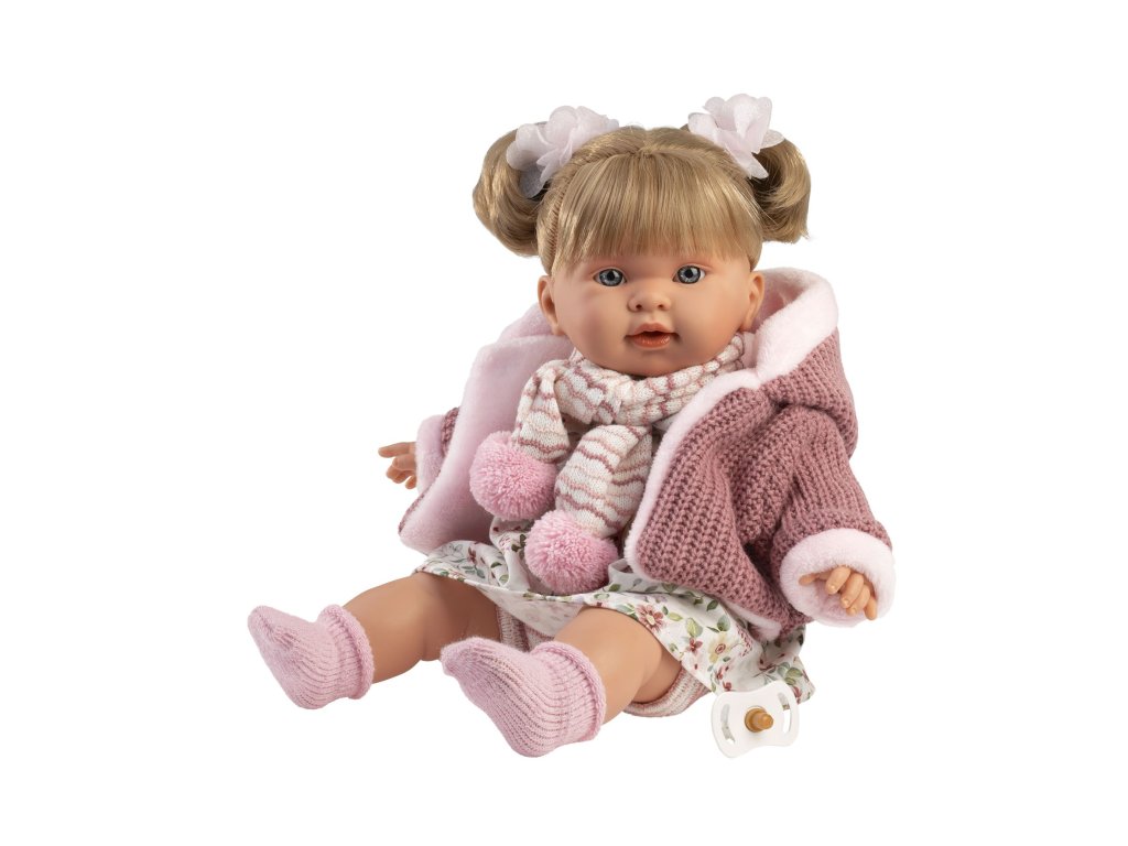 Mluvící a plačící panenka (po vyjmutí pojistky ihned funkční) s měkkým látkovým tělem a s vlásky po celé hlavě. Hlava a končetiny jsou vyrobené z kvalitního měkčeného vinylu. Po vytažení dudlíku z úst začne panenka říkat „mama“, „papa“ a vydávat reálný zvuk plačícího dítěte, který lze utišit opět magnetickým dudlíkem. Velikost panenky 42 cm. Ručně vyrobeno ve Španělsku, baleno v dárkové krabici. Doporučený věk od 3 let. K panence je možné dokoupit další originální oblečení z nabídky Llorens pro panenky velikosti 42 cm. Součástí balení je 3 x knoflíková baterie LR44 s návodem na její výměnu. Baterie jsou spotřební zboží a proto jejich vybití není důvodem k reklamaci panenky.