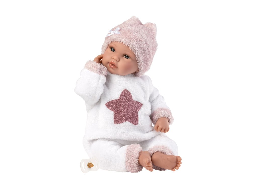 Mluvící miminko s měkkým látkovým tělem, které po zatlačení na hrudník začne říkat „mama“, „papa“ a vydávat reálný zvuk plačícího miminka. Ruce a nohy jsou k tělu přichyceny kloubem. Miminko je polohovací a může i sedět. Dudlík v balení slouží pouze jako doplněk. Velikost 36 cm. Ručně vyrobeno ve Španělsku, baleno v dárkové krabici. Doporučený věk od 3 let. K miminku je možné dokoupit další originální oblečení z nabídky Llorens pro miminka NEW BORN velikosti 35-36 cm. Součástí balení je 3 x knoflíková baterie LR44 s návodem na její výměnu. Baterie jsou spotřební zboží a proto jejich vybití není důvodem k reklamaci panenky.