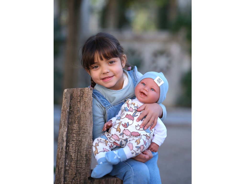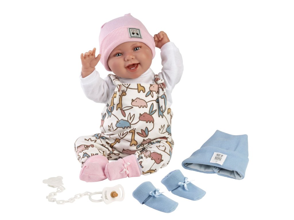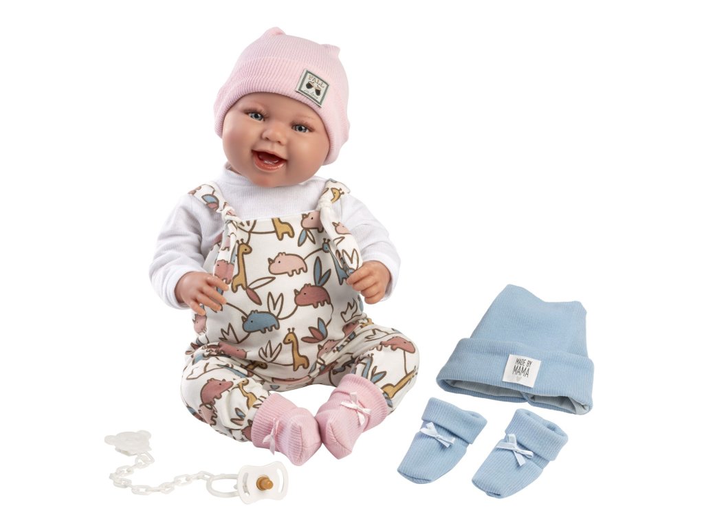 Mluvící miminko s měkkým látkovým tělem, které se po zatlačení na hrudník začne smát a říkat „mama“, „papa“. Ruce a nohy jsou k tělu přichyceny kloubem. Miminko je polohovací a může i sedět. Přiložené doplňkové oblečení (čepička a ponožky) umožnují mít z miminka při hraní jak variantu holčičky, tak chlapečka. Dudlík v balení slouží pouze jako doplněk. Velikost 44 cm. Ručně vyrobeno ve Španělsku, baleno v dárkové krabici. Doporučený věk od 3 let. K miminku je možné dokoupit další originální oblečení z nabídky Llorens pro miminka NEW BORN velikosti 43-45 cm. Součástí balení je 3 x knoflíková baterie LR44 s návodem na její výměnu. Baterie jsou spotřební zboží a proto jejich vybití není důvodem k reklamaci panenky.