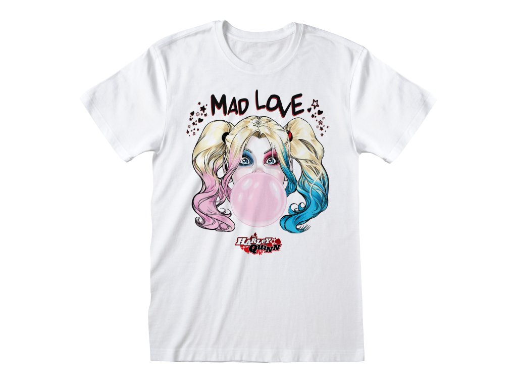 Bilé pánské tričko inspirované postavou Harley Quinn a nápisem Mad Love.
