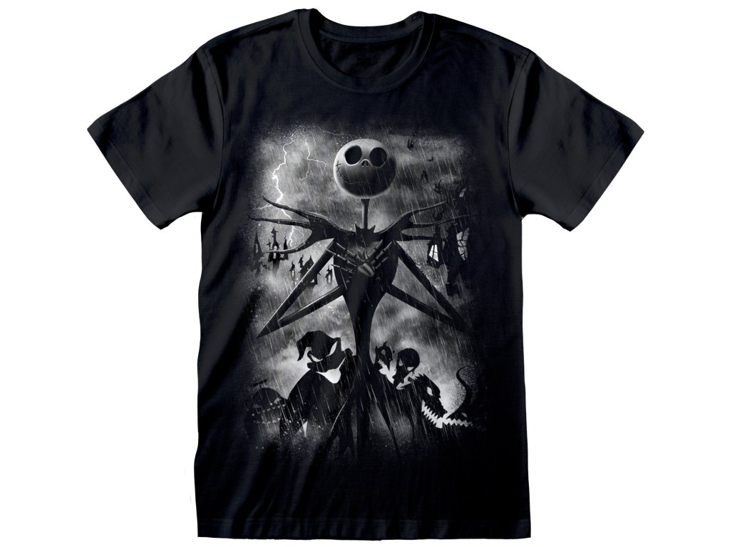 Atraktivní černé tričko s krátkým rukávem s grafikou Jacka Skellingtona a bouřlivého nebe z animovaně-loutkového muzikálu The Nightmare Before Christmas. Tričko je vhodné pro každého fanouška.
