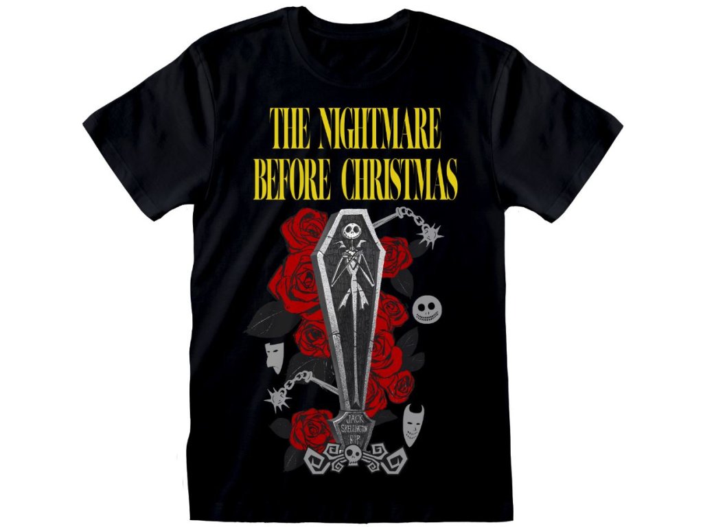 Atraktivní černé tričko s krátkým rukávem s grafikou Jacka Skellingtona v rakvi a žlutým nápisem animovaně-loutkového muzikálu The Nightmare Before Christmas. Tričko je vhodné pro každého fanouška.