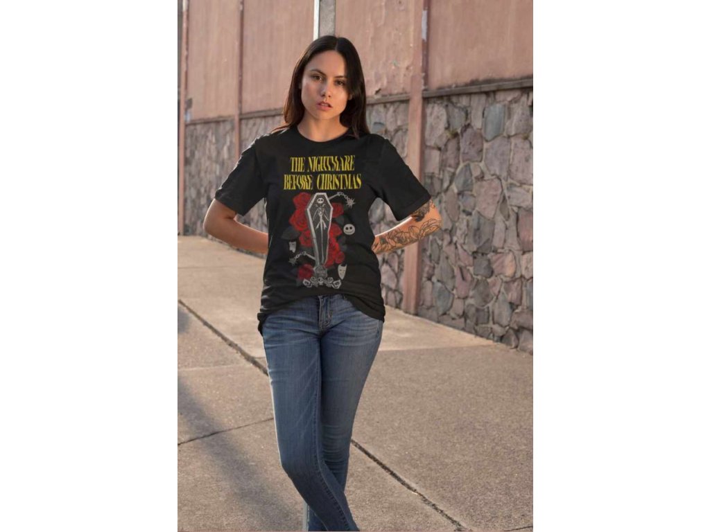 Atraktivní černé tričko s krátkým rukávem s grafikou Jacka Skellingtona v rakvi a žlutým nápisem animovaně-loutkového muzikálu The Nightmare Before Christmas. Tričko je vhodné pro každého fanouška.