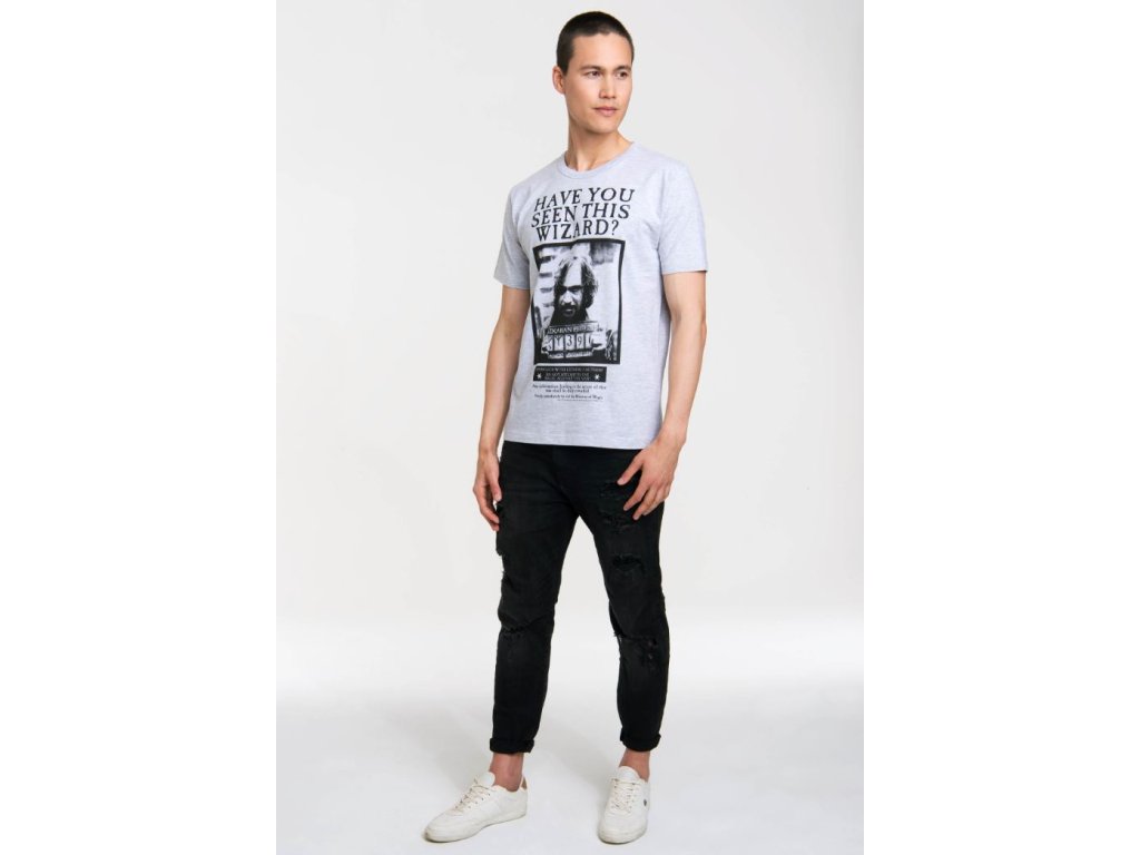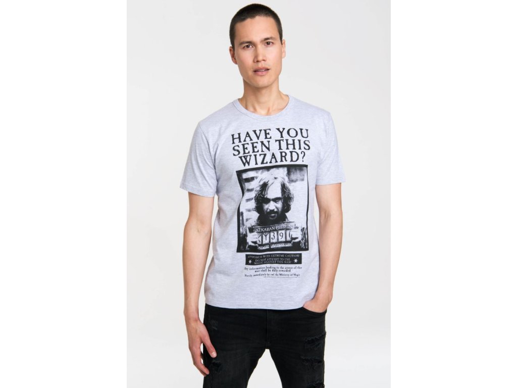 Šedé pánské tričko s motivem fotografie Siriuse Blacka a známého nápisu: Have you seen this wizard?