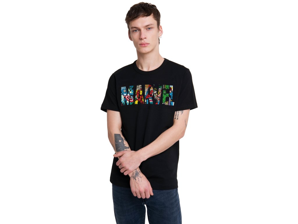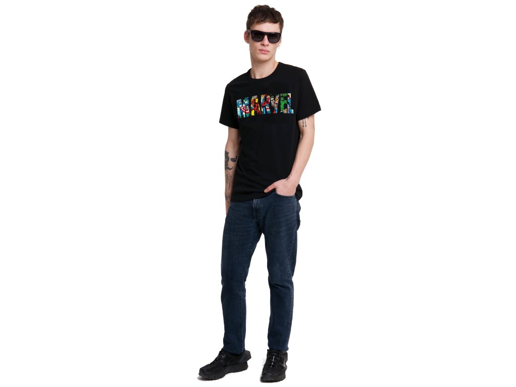 Atraktivní černé pánské tričko s krátkým rukávem a grafikou loga Marvel a hrdinů Avengers.