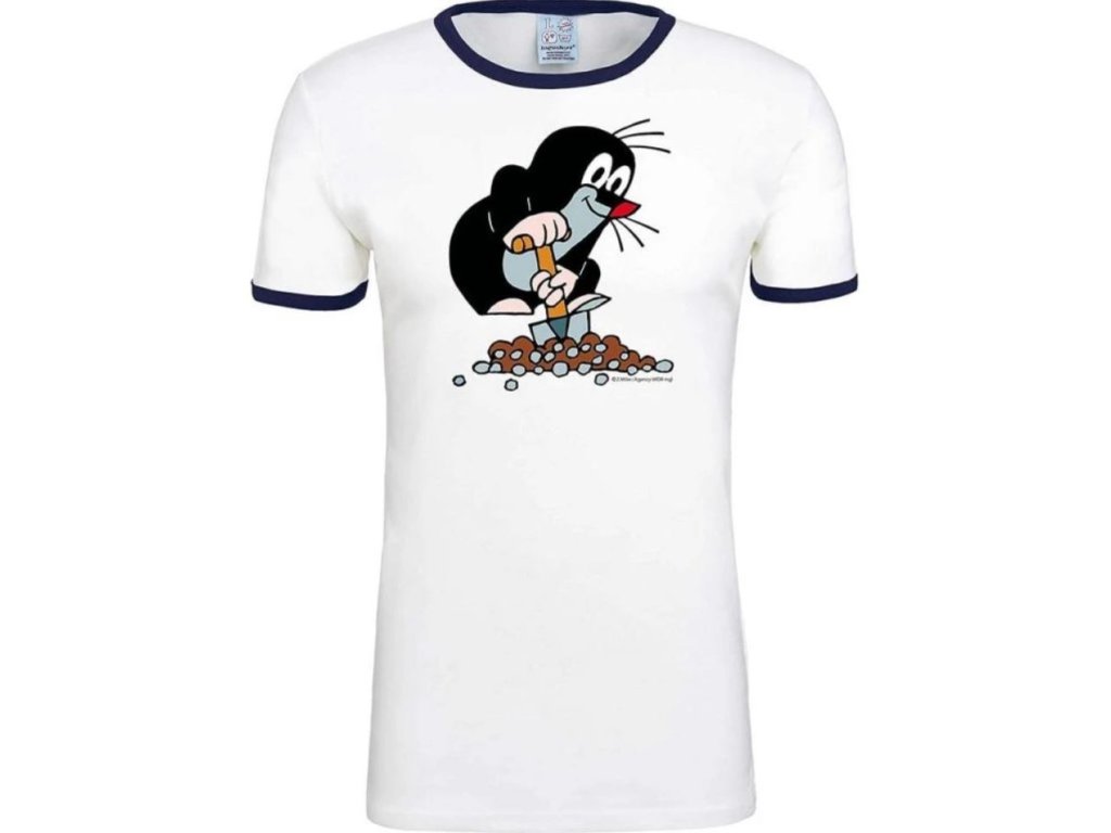 Bavlněné bílé tričko s modrým lemováním s grafikou Krtečka s rýčem na kopečku. Tričko je vhodným dárkem pro všechny menší i větší fanoušky, kteří chtějí mít Krtečka stále u sebe.
