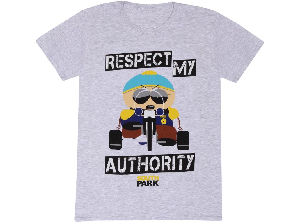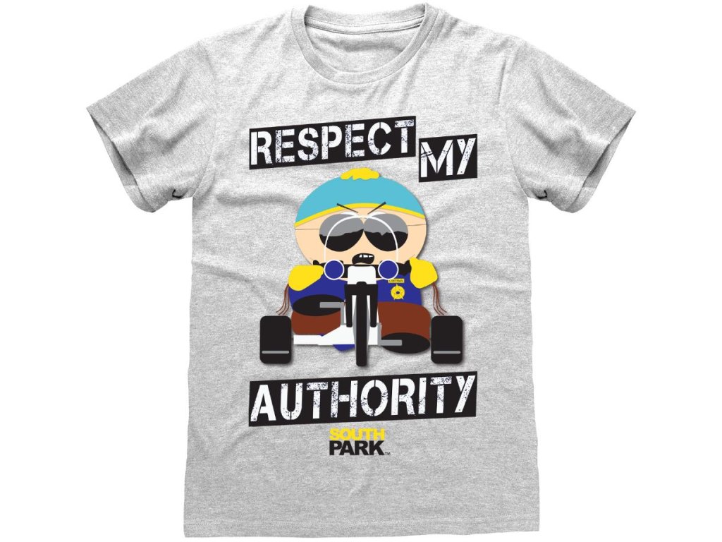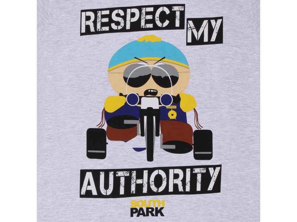 Šedé pánské tričko s krátkým rukávem s grafikou Cartmana a nápisem: ,,Respekt my authority" z komediálního animovaného seriálu South Park. Tričko je vhodné pro každého fanouška, který si nechce nechat vzít svou autoritu!