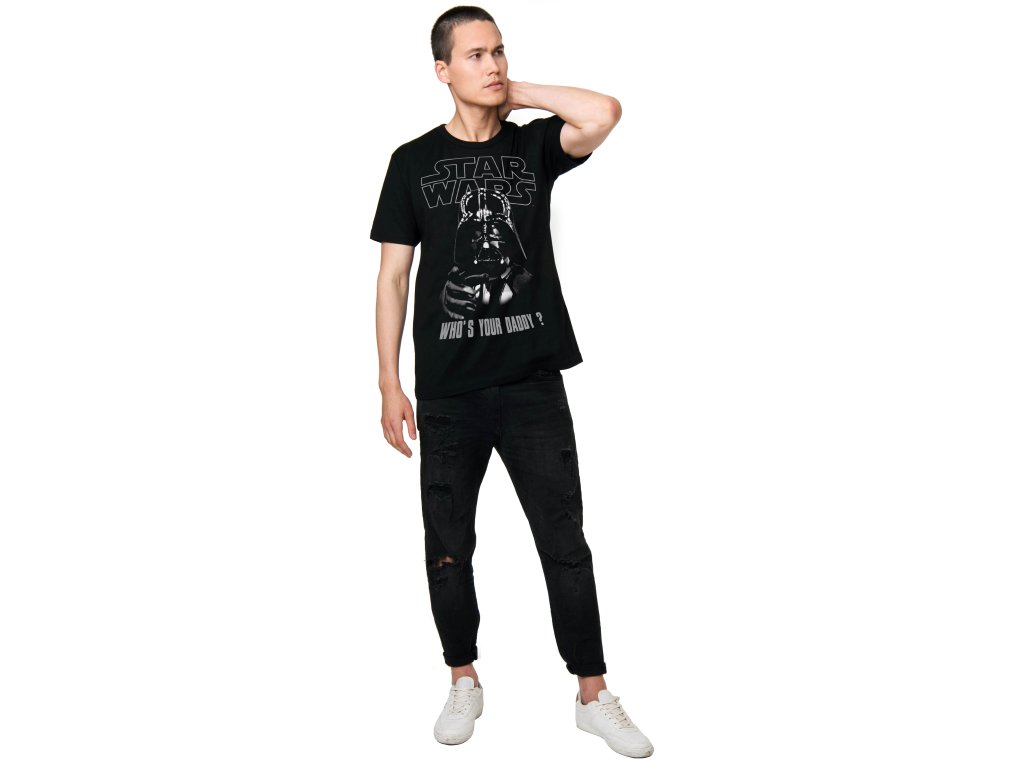 Černé pánské tričko s krátkým rukávem vyvedené v motivu postavy Darth Vadera, nápisem "Who's Your Daddy?" a logem Hvězdných válek.