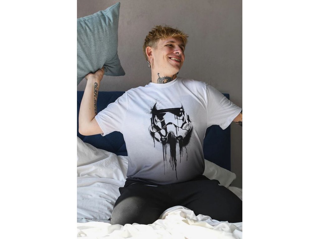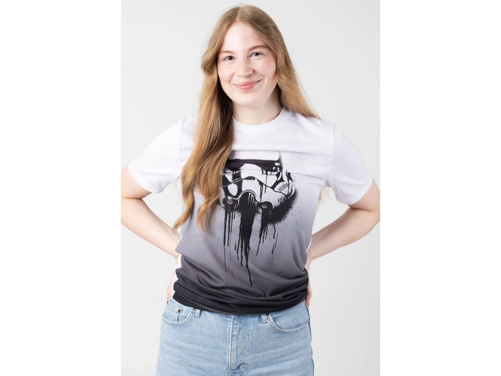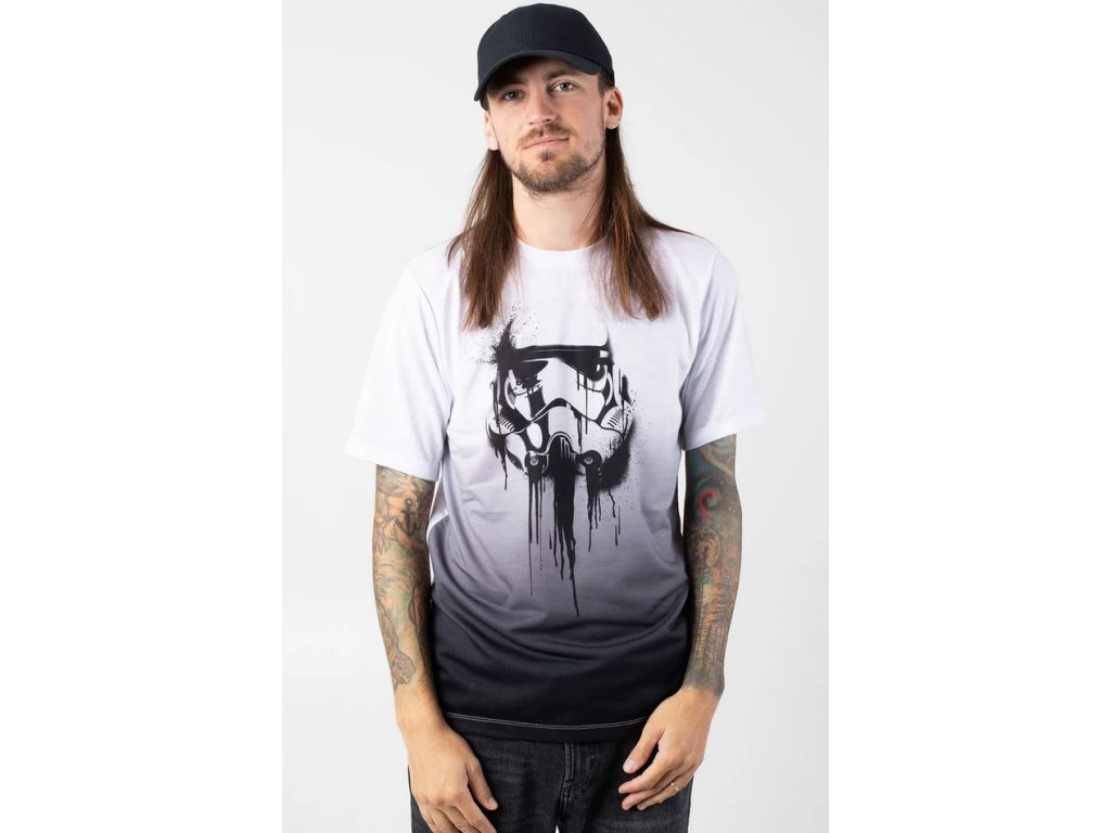 Atraktivní ombré tričko s krátkým rukávem s grafikou roztávajícího se Stormtroopera. Tričko jde z čistě bílé barvy do světle šedé, a naspod je tmavě šedé. Všechny takto rozpoložené barvy připomínají ombré efekt.