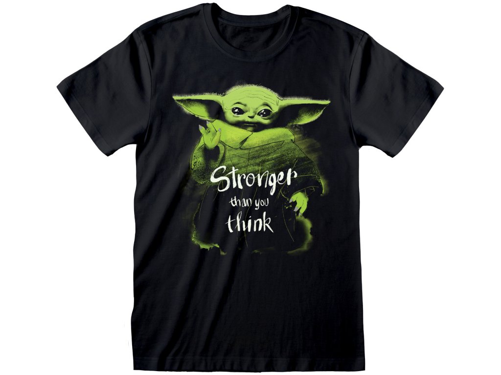 Atraktivní černé pánské tričko s krátkým rukávem s grafikou Baby Yody a nápisem: ,,Stronger than you think" z televizního seriálu Star Wars: The Mandalorian. Tričko je vhodným doplňkem každého fanouška.
