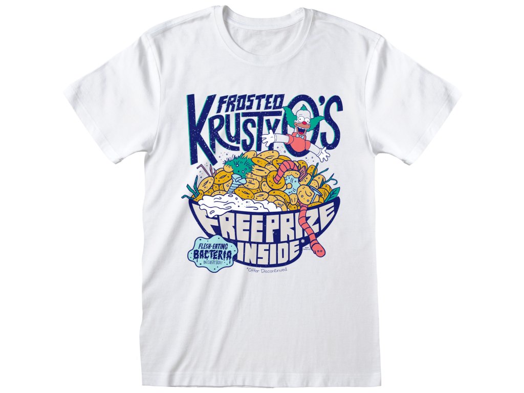 Atraktivní bílé tričko s grafikou značky snídaňových cereálií Frosted Krusty Q´s. Tričko je vhodné pro všechny fanoušky seriálu Simpsonovi.