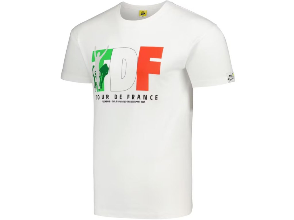 Atraktivní bílé tričko s krátkým rukávem s italským logem světoznámého závodu pořádaného od roku 1903 ve Francii a končícího v Paříži: Tour de France.