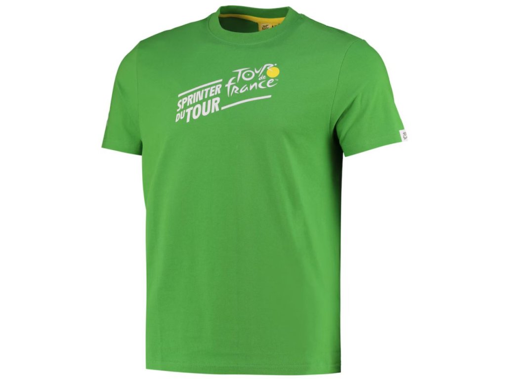Atraktivní zelené tričko s krátkým rukávem s nápisem: ,,vedoucí závodník'' světoznámého závodu pořádaného od roku 1903 ve Francii a končícího v Paříži: Tour de France.