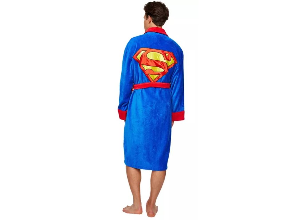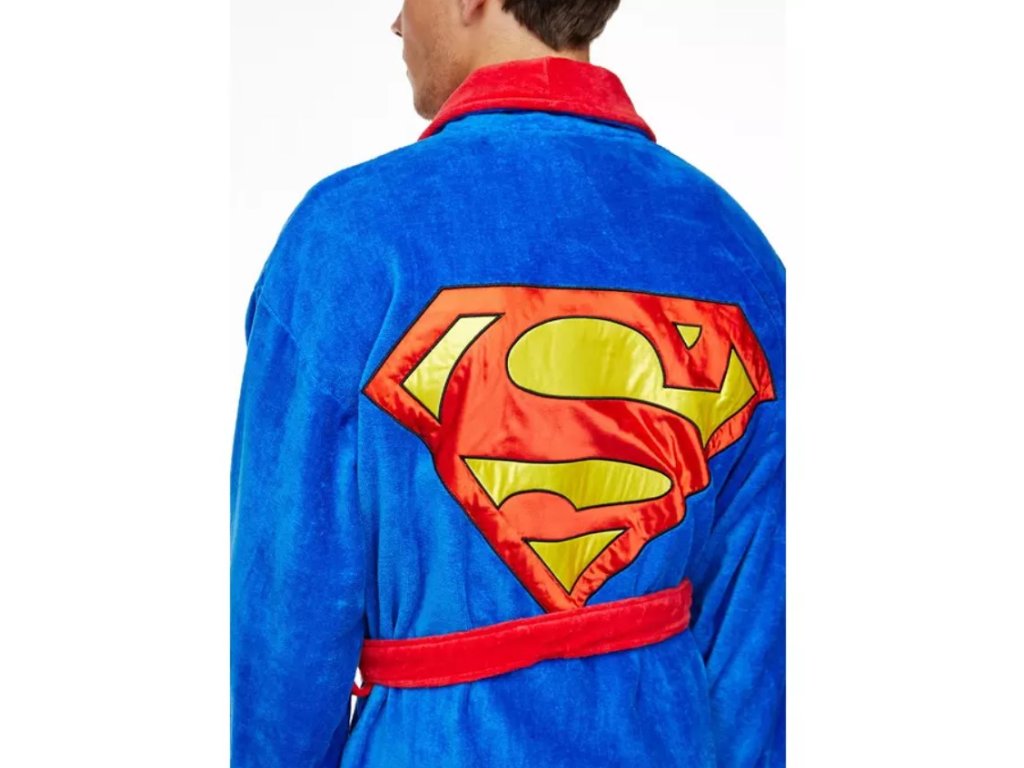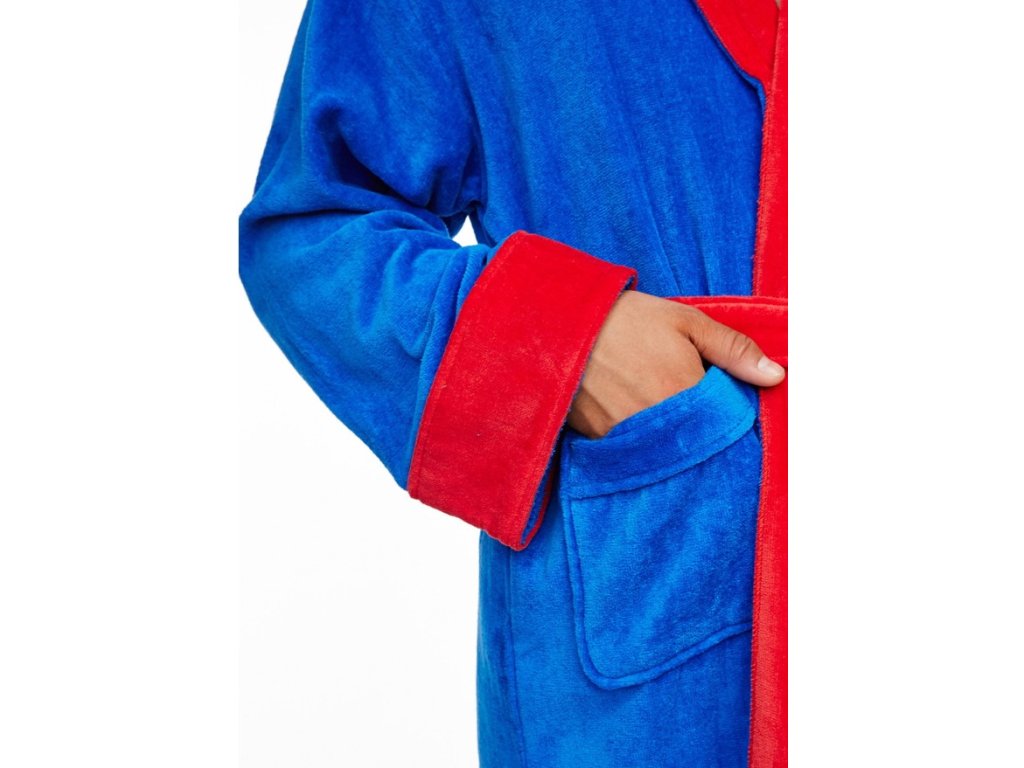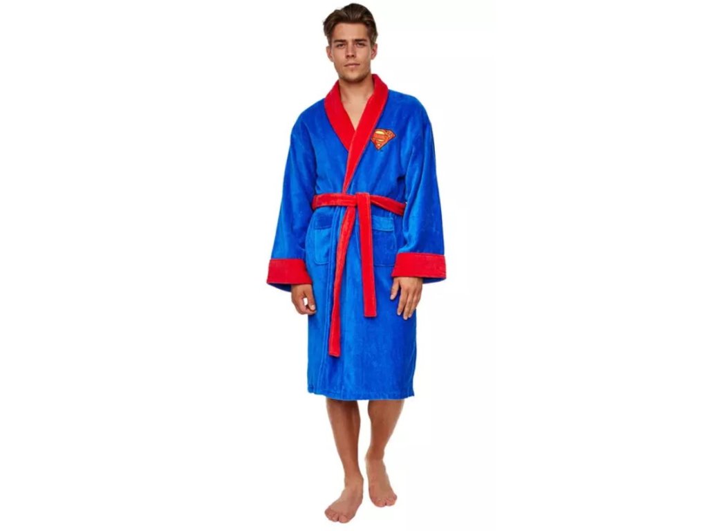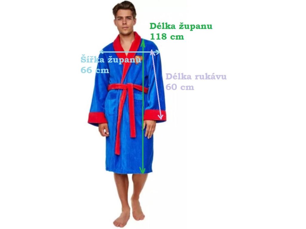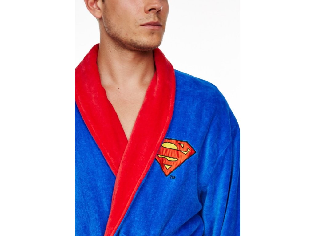 Kvalitní modrý pánský župan s kapsami a páskem pro všechny milovníky DC Comics. Na hrudi i na zádech je klasické červeno-žluté logo Superman. Celý župan má červené lemování.