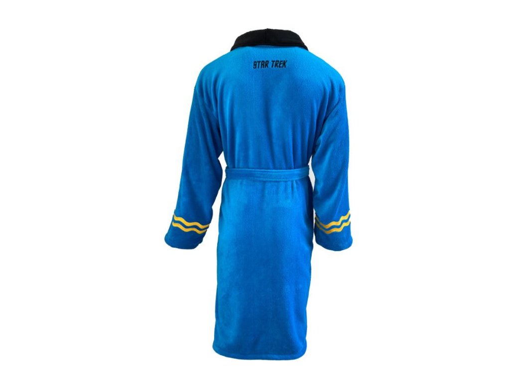 Modrý kvalitní pánský župan s předními kapsami,páskem a černým lemem kolem krku a žlutými detaily. Na hrudi je vyšité žluté logo Star Trek a na zadní straně županu je vyšitý nápis.