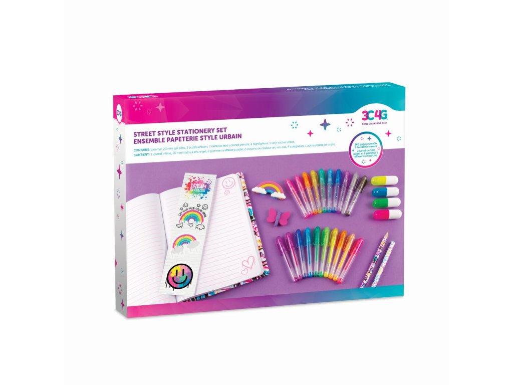 Velká otočná sada kancelářských potřeb obsahuje blok, 20 mini gelových per, 2 gumy, 2 barevné tužky, 4 zvýraznovače, 4 vinylové samolepky.