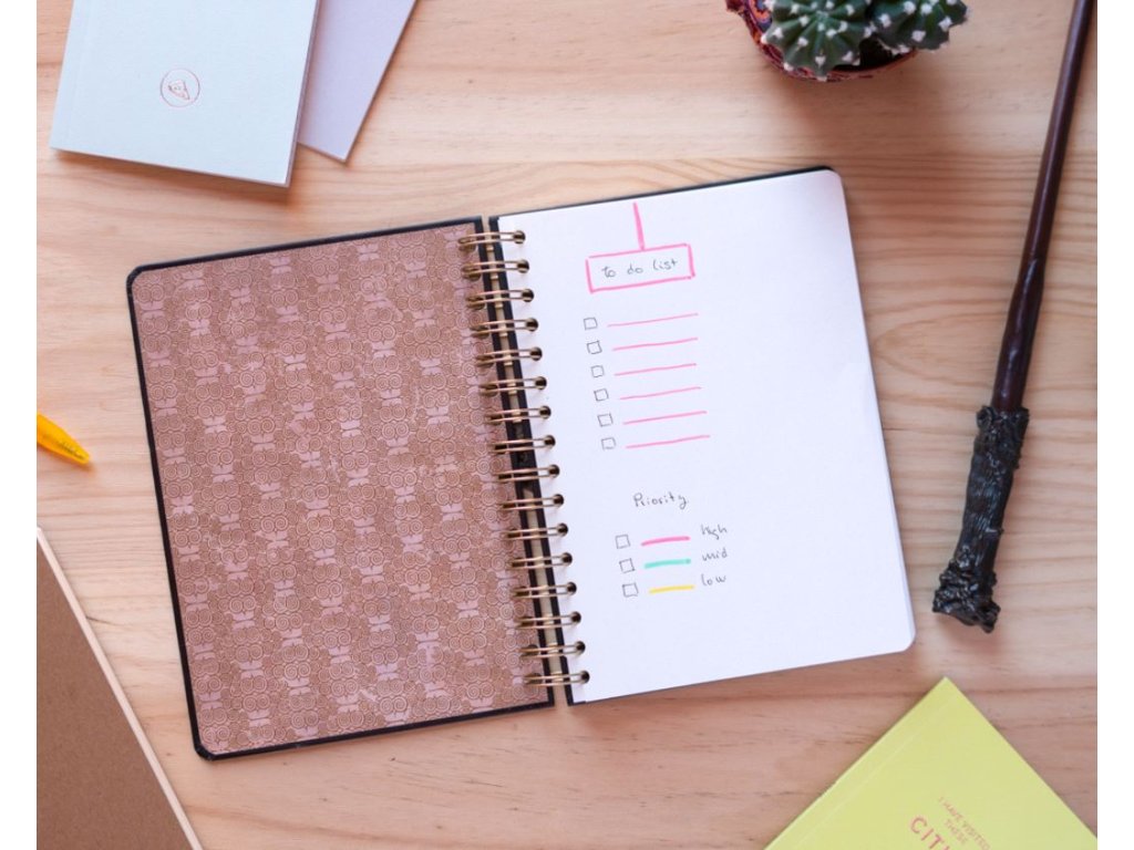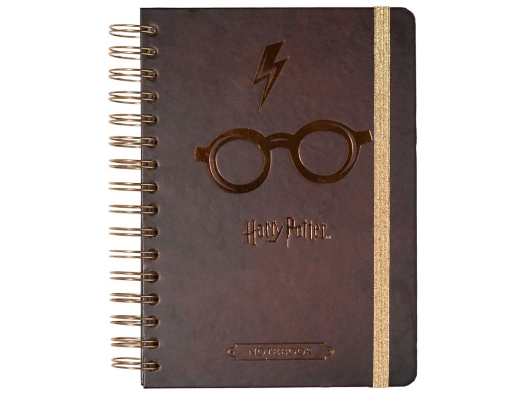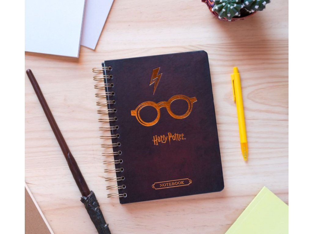 Zápisník s kroužkovou vazbou ve formátu A5 s 90 nelinkovanými listy s grafikou brýlí a jizvy od kouzelníka Harryho Pottera. Zápisník je vhodným pomocníkem všech malých i velkých čarodějů, kteří si chtějí svá kouzla zapsat.