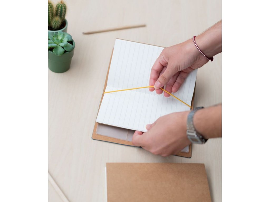 Koženkový obal stahovatelný praktickou gumou obsahuje dva samostatné a gumou uchycené poznámkové bloky