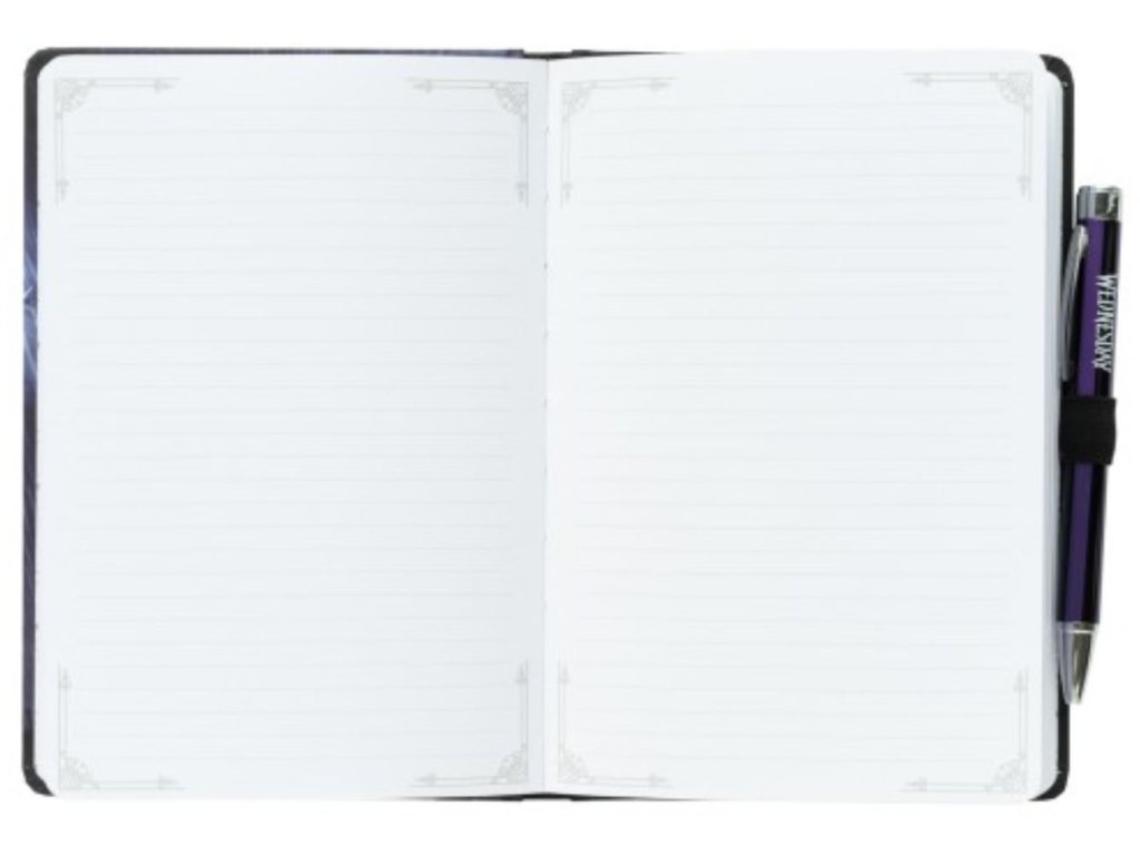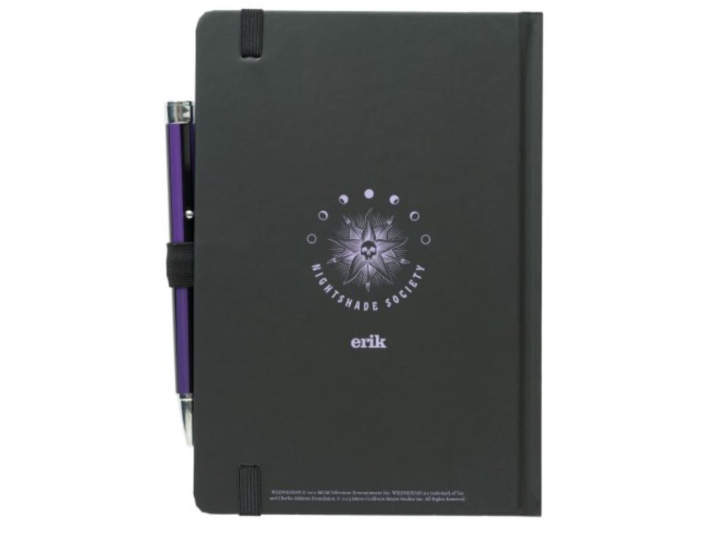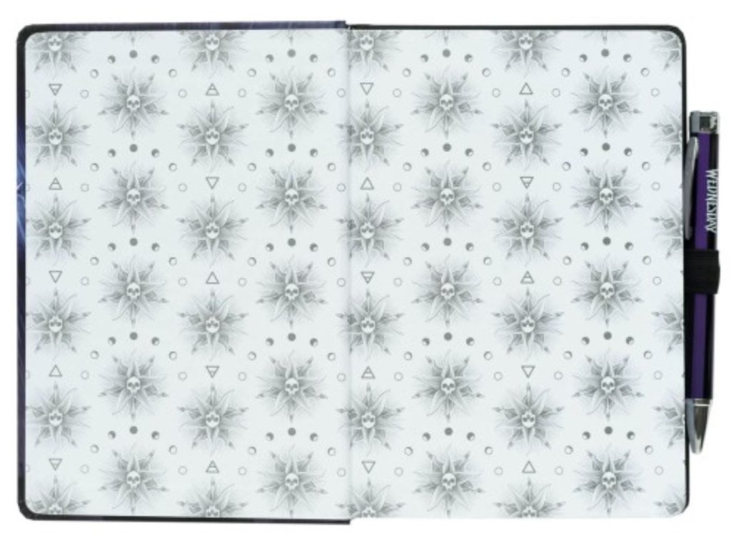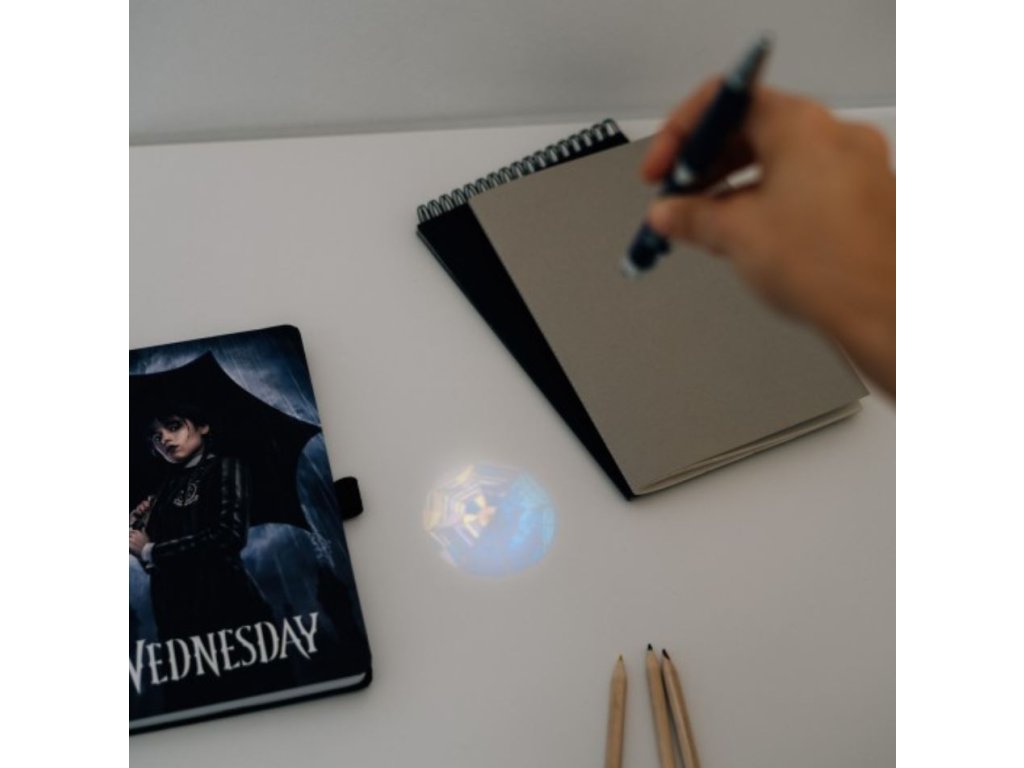 Oficiální produkt - zápisník s promítací propiskou z katalogu výrobků s licencí a grafikou amerického seriálu Wednesday od společnosti Netflix.