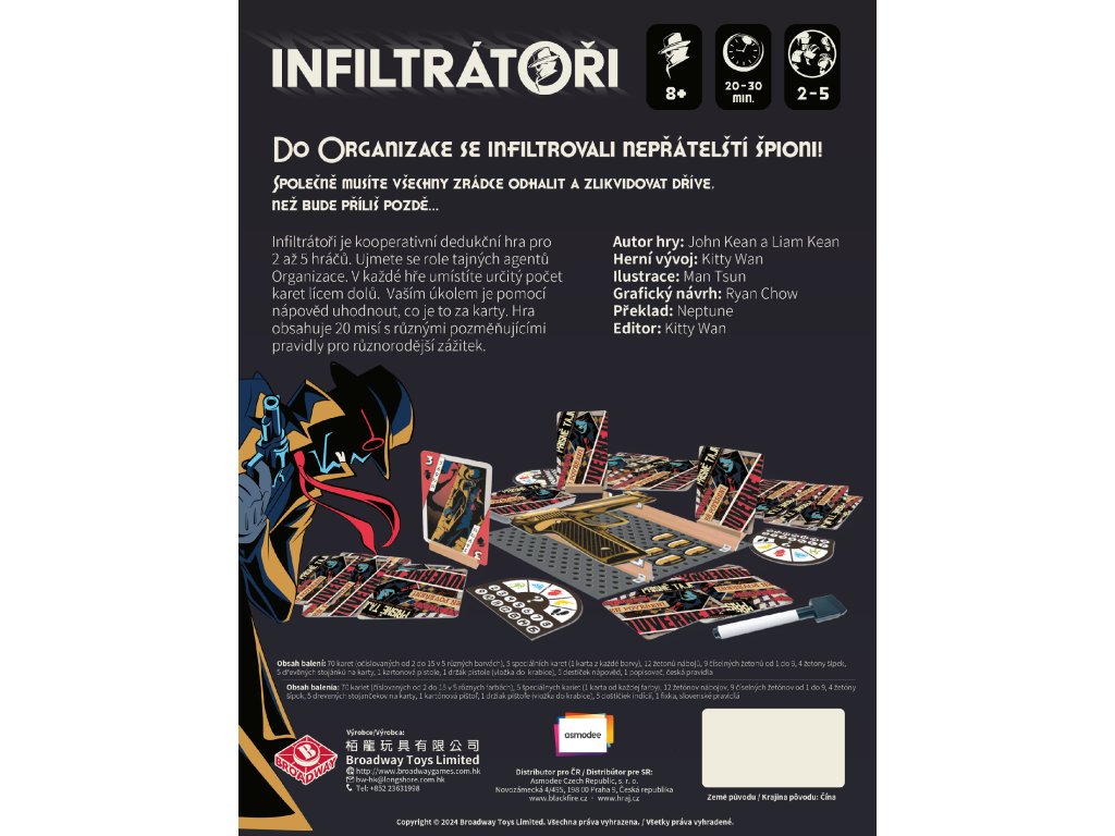 Infiltrátoři jsou kooperativní dedukční hra pro 2 až 5 hráčů. Ujmete se role tajných agentů Organizace. V každé hře umístíte určitý počet karet lícem dolů. Vaším úkolem je pomocí nápověd uhodnout, co je to za karty. Hra obsahuje 20 misí s různými pozměňujícími pravidly pro různorodější zážitek, z nichž každá má speciální vítěznou podmínku. Agenti vyhrávají nebo prohrávají společně. Vaším cílem coby agentů je identifikovat všechny zrádce dříve, než vyprší čas a zrádci vaši organizaci zcela zničí!