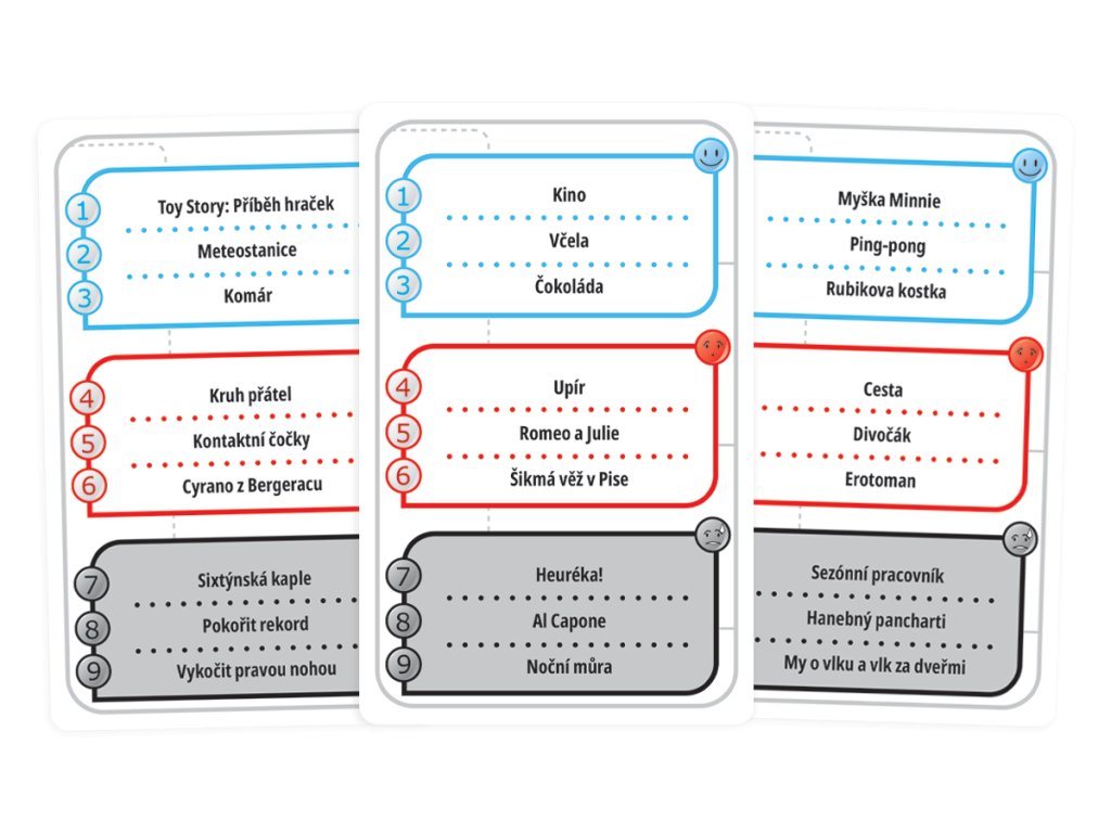 Karty Konceptu obsahují slova a fráze tří stupňů obtížnosti - lehké, těžké a výzva. Pro první hry doporučujeme používat jen jednoduchá slova. Fráze z obtížnosti výzva již vyžadují od všech hráčů skutečně dokonalé zvládnutí hry.