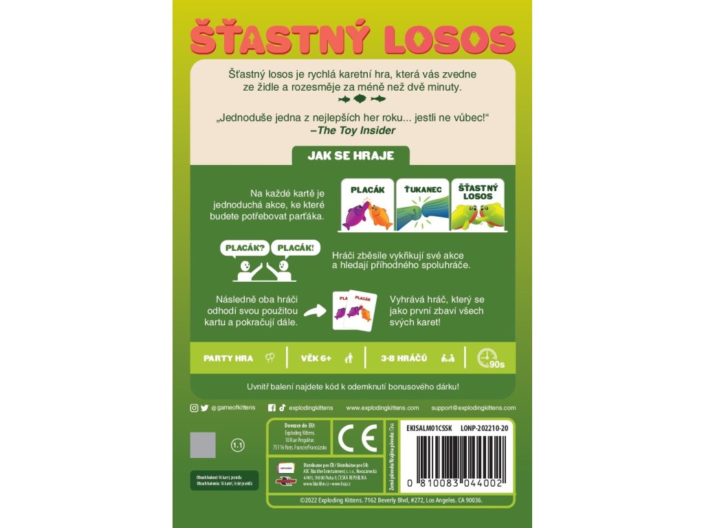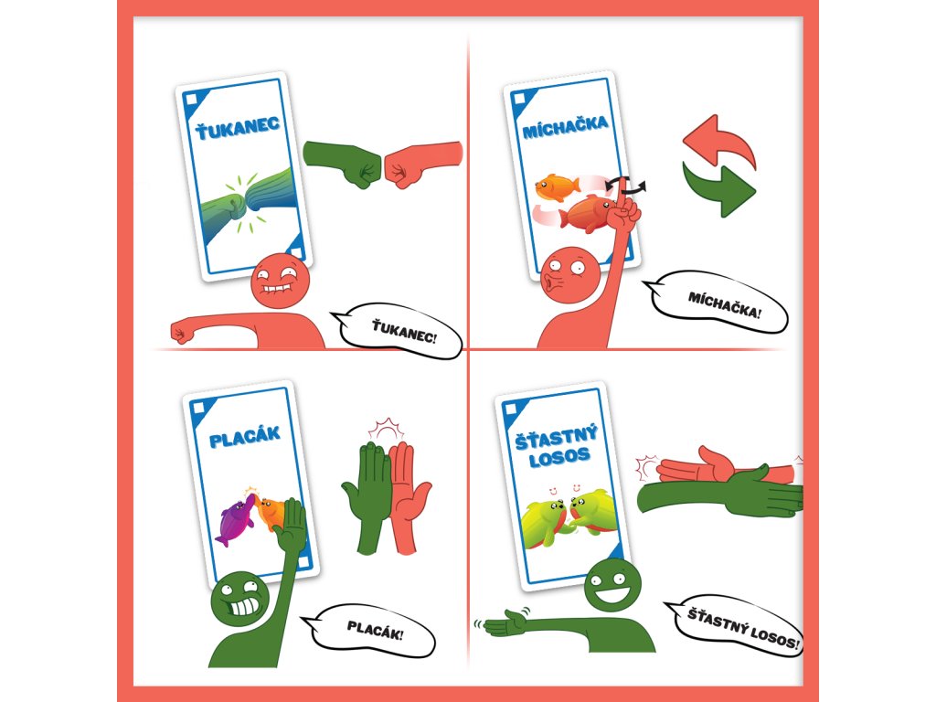 Šťastný losos je rychlá, pohybová a HLASITÁ hra, která vás rozesměje za méně než dvě minuty. Takže vykliďte prostor, zbavte se židlí a pokud vám srdeční tep vyskočí na 120 úderů za minutu, nejspíš to děláte dobře.