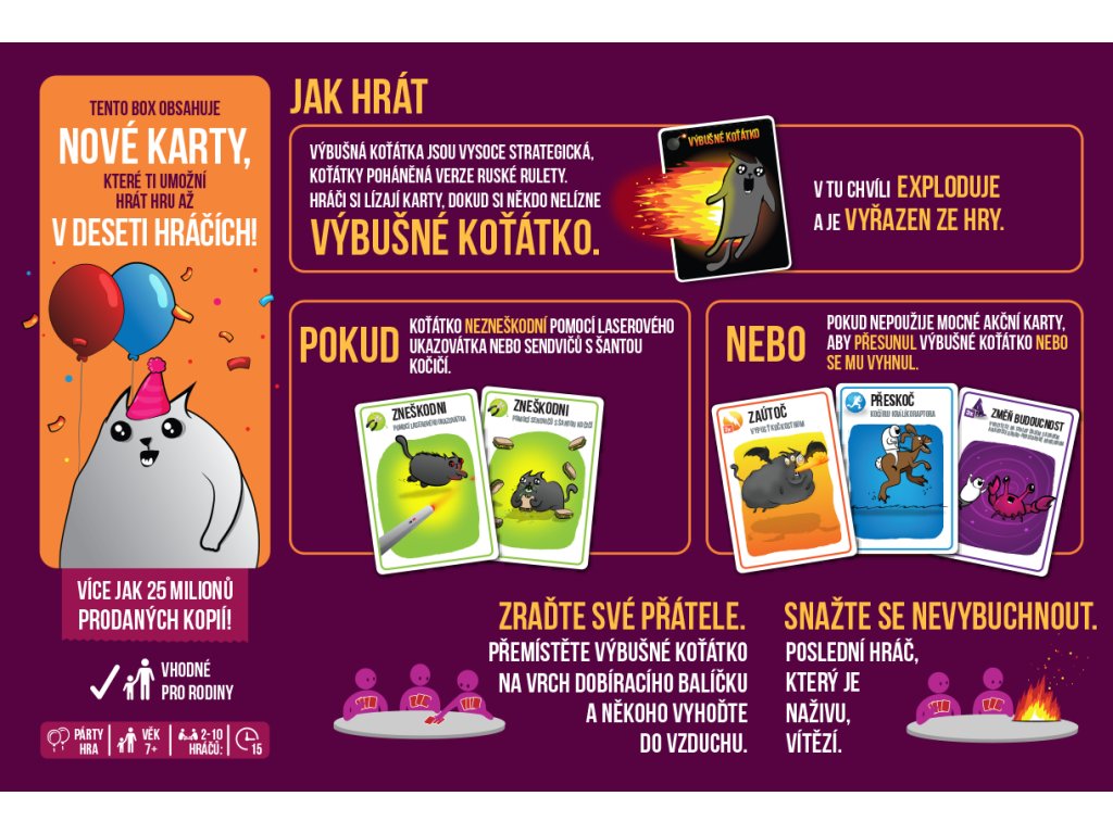 Výbušná koťátka jsou extrémně strategickou verzí ruské rulety (jen s koťátky). Hráči si dobírají karty, dokud si někdo nelízne Výbušné koťátko, exploduje, umře a je vyřazen ze hry. Pokud ten hráč nemá kartu Zneškodni, která mu umožní zneškodnit koťátko pomocí laserového ukazovátka, podrbáním na bříšku nebo sendviče s šantou kočičí. Úkolem všech ostatních karet v balíčku je pomoci hráčům držet se Výbušným koťátkům z cesty (nebo je nastrčit do cesty ostatním).