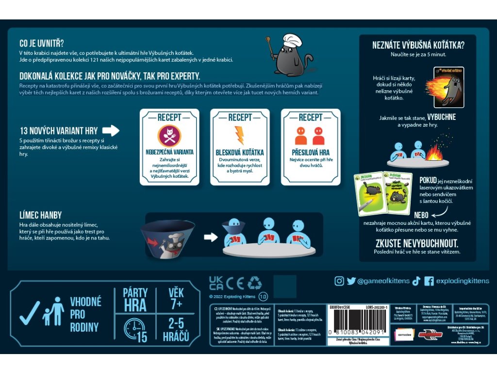 Vhodná pro začátečníky, naučíte se ji během 2 minut - Je to jednoduché! Pokud si vytáhnete výbušné koťátko, prohrajete a jistě vás to zaplaví obrovským smutkem... Všechny ostatní karty v balíčku vám pomohou vyhnout se riziku vytažení výbušného koťátka nebo zneutralizují jeho účinek. Pokud nevybuchnete, VYHRÁLI JSTE!